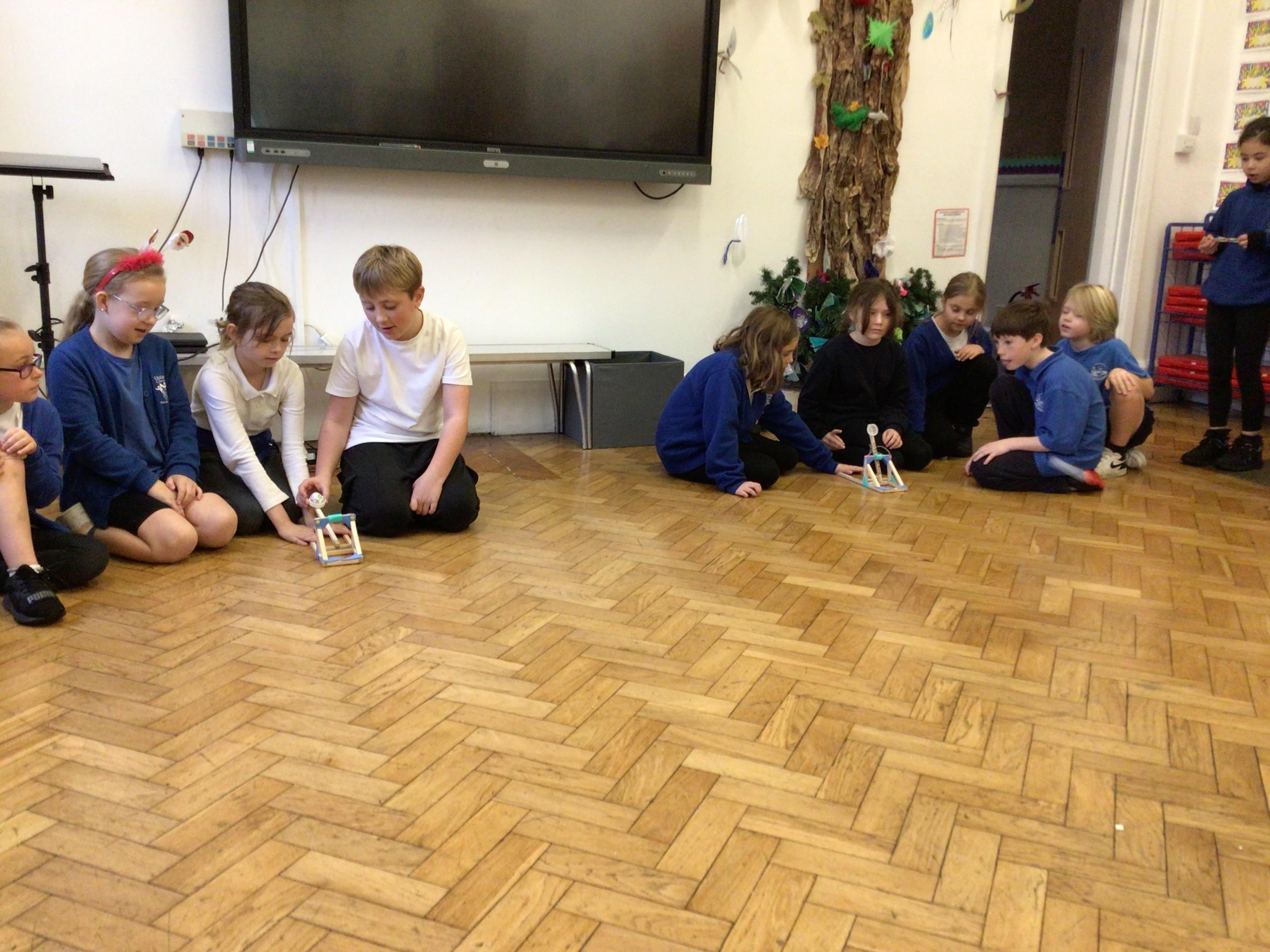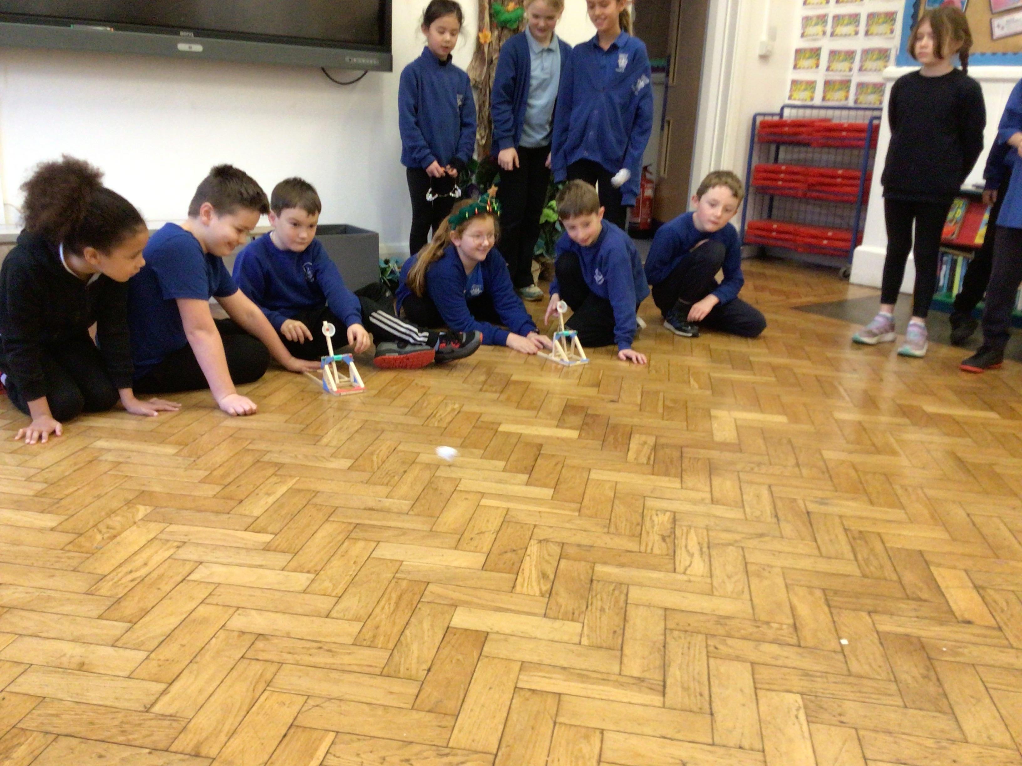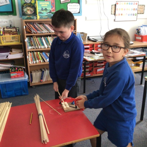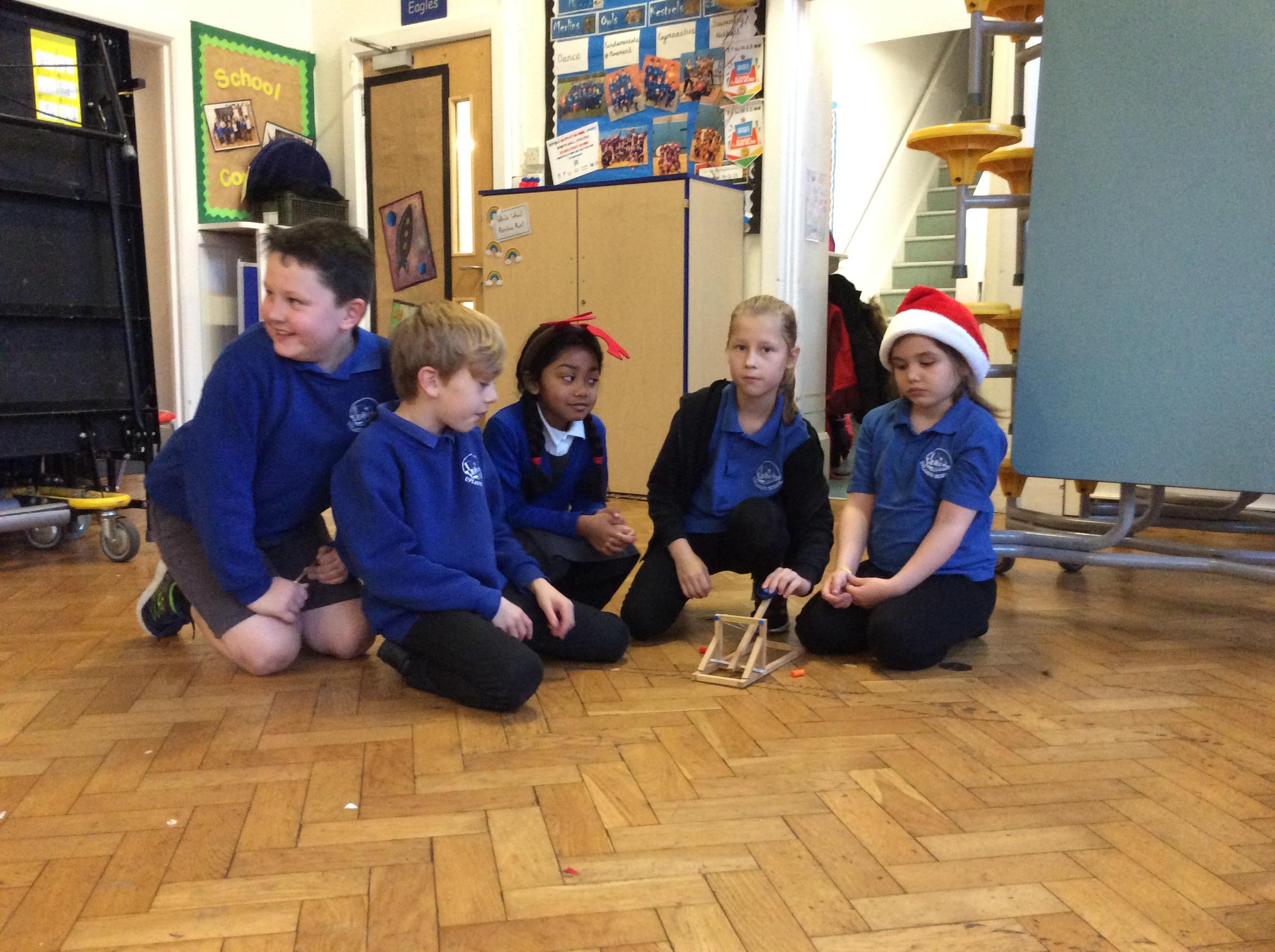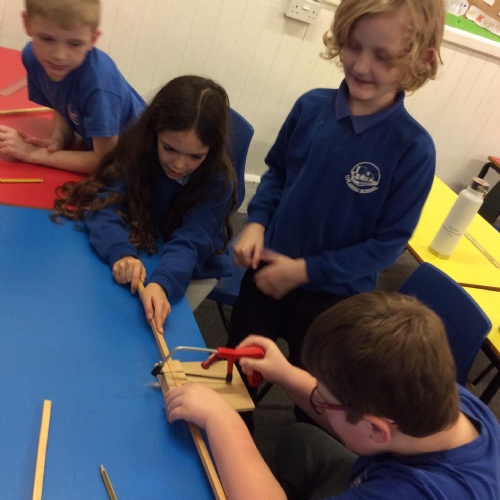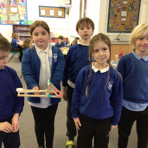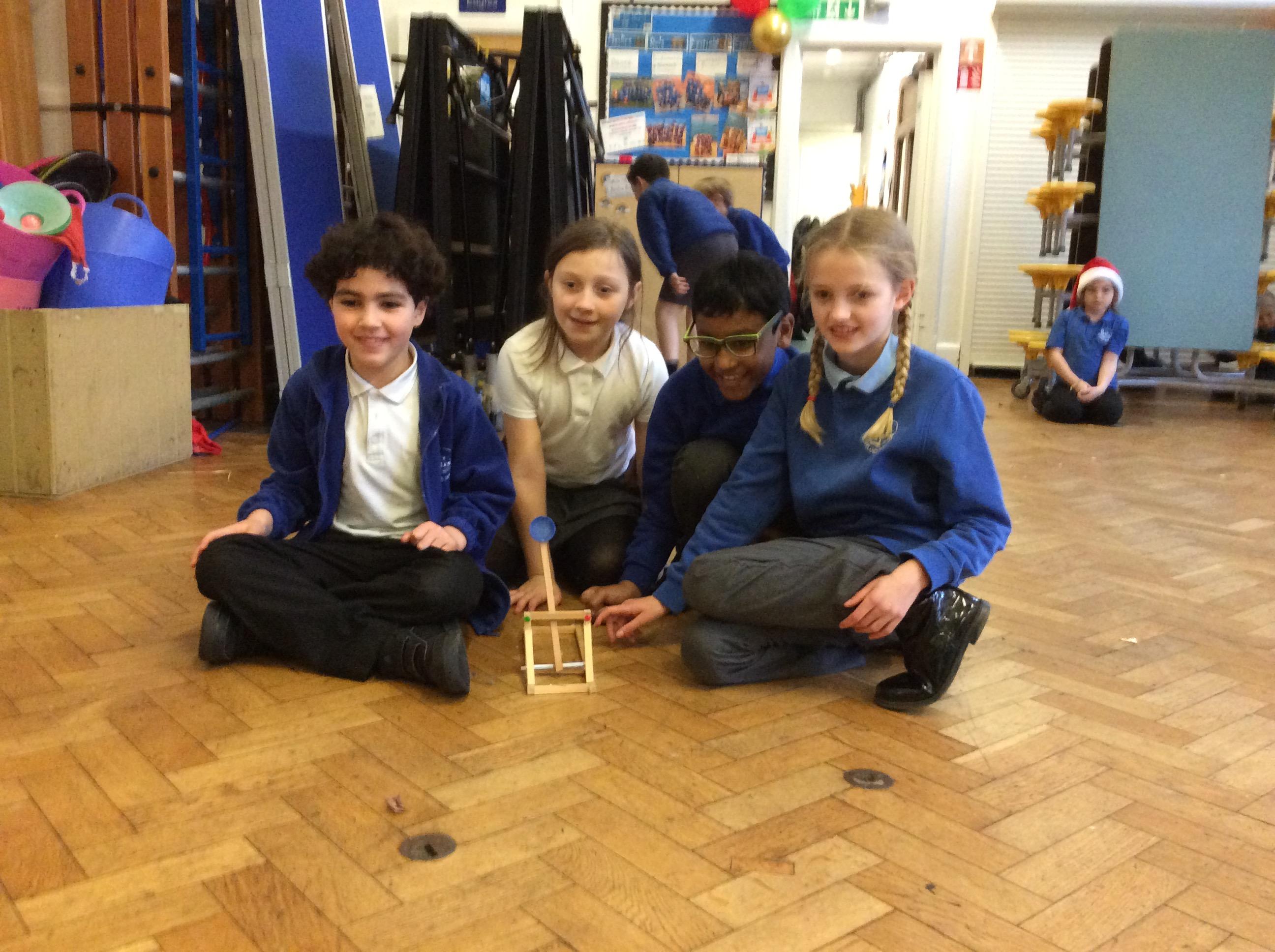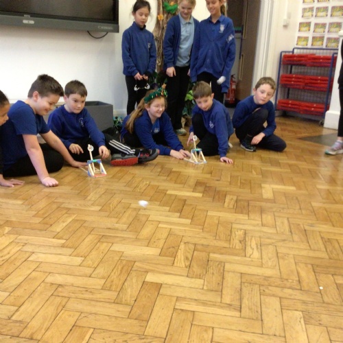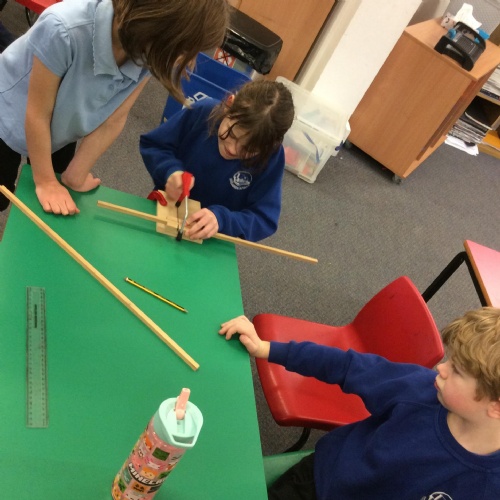 We finished our catapults this week and enjoyed trying them out with tin foil balls and corks. We were seeing how far across the hall we could get them.
