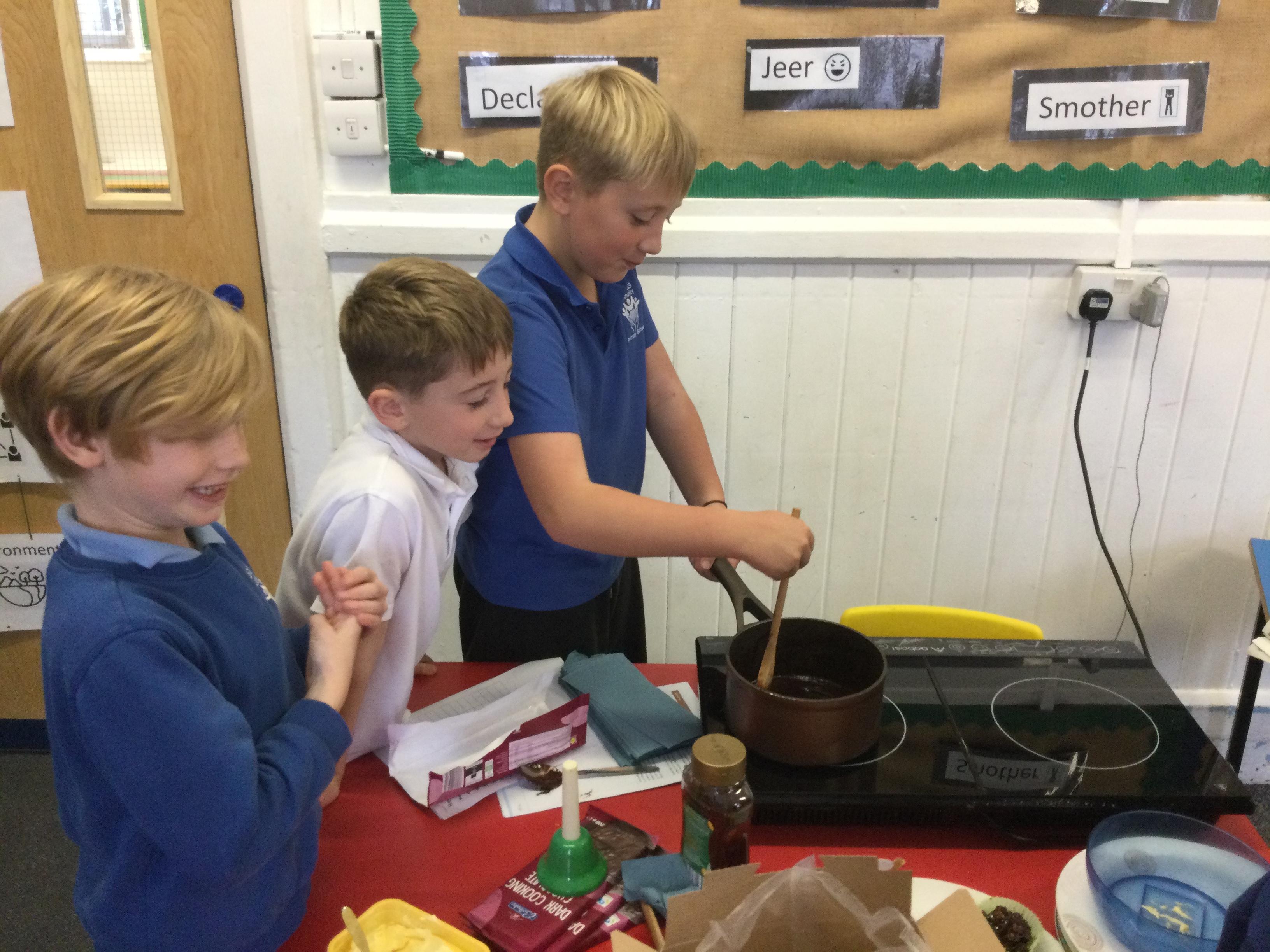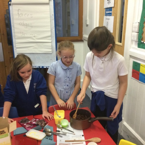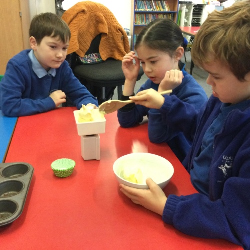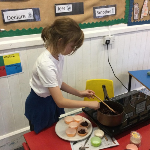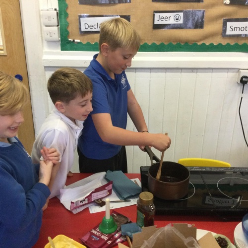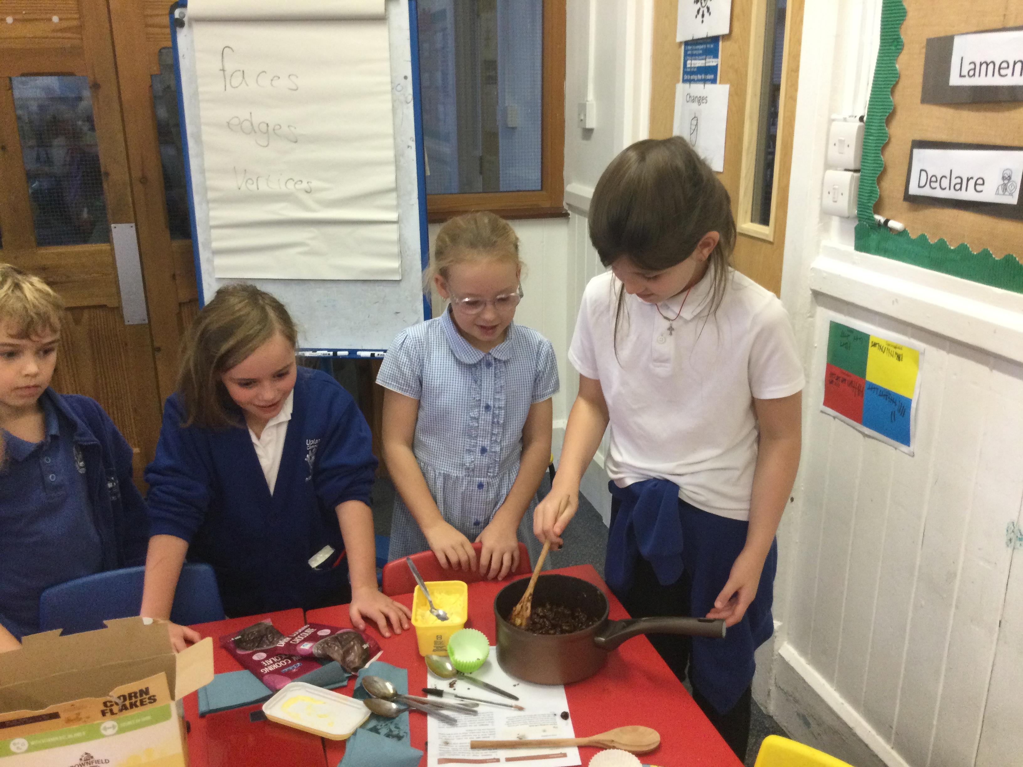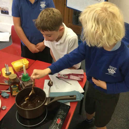 This week, in English, we've been planning and writing our factual tour about how to make chocolate cornflake cakes. We have been able to include lots of our science work about changing states of matter. We have been focusing on using subordinating conjunctions in our writing and using the correct determiners a or an before a noun.