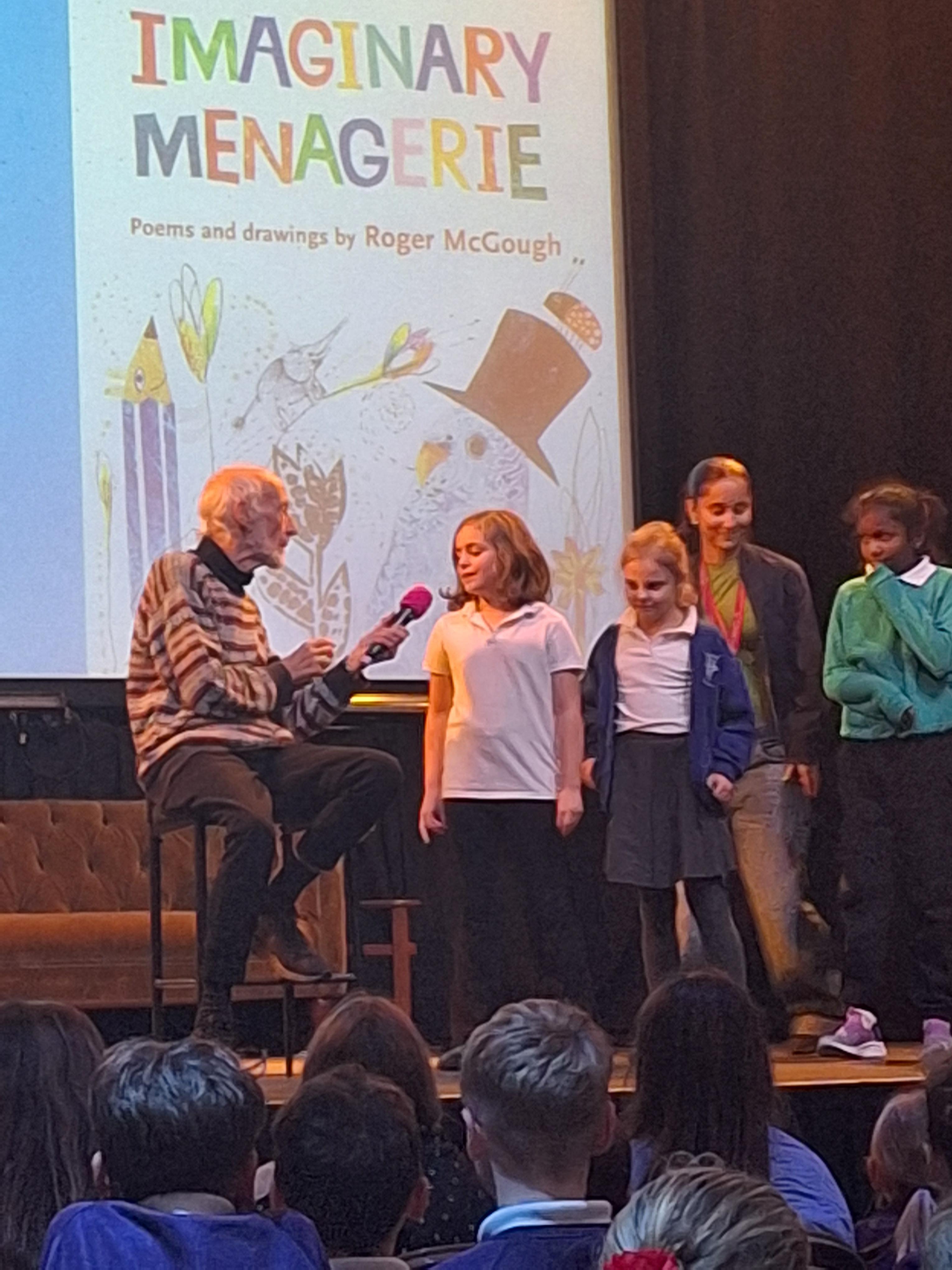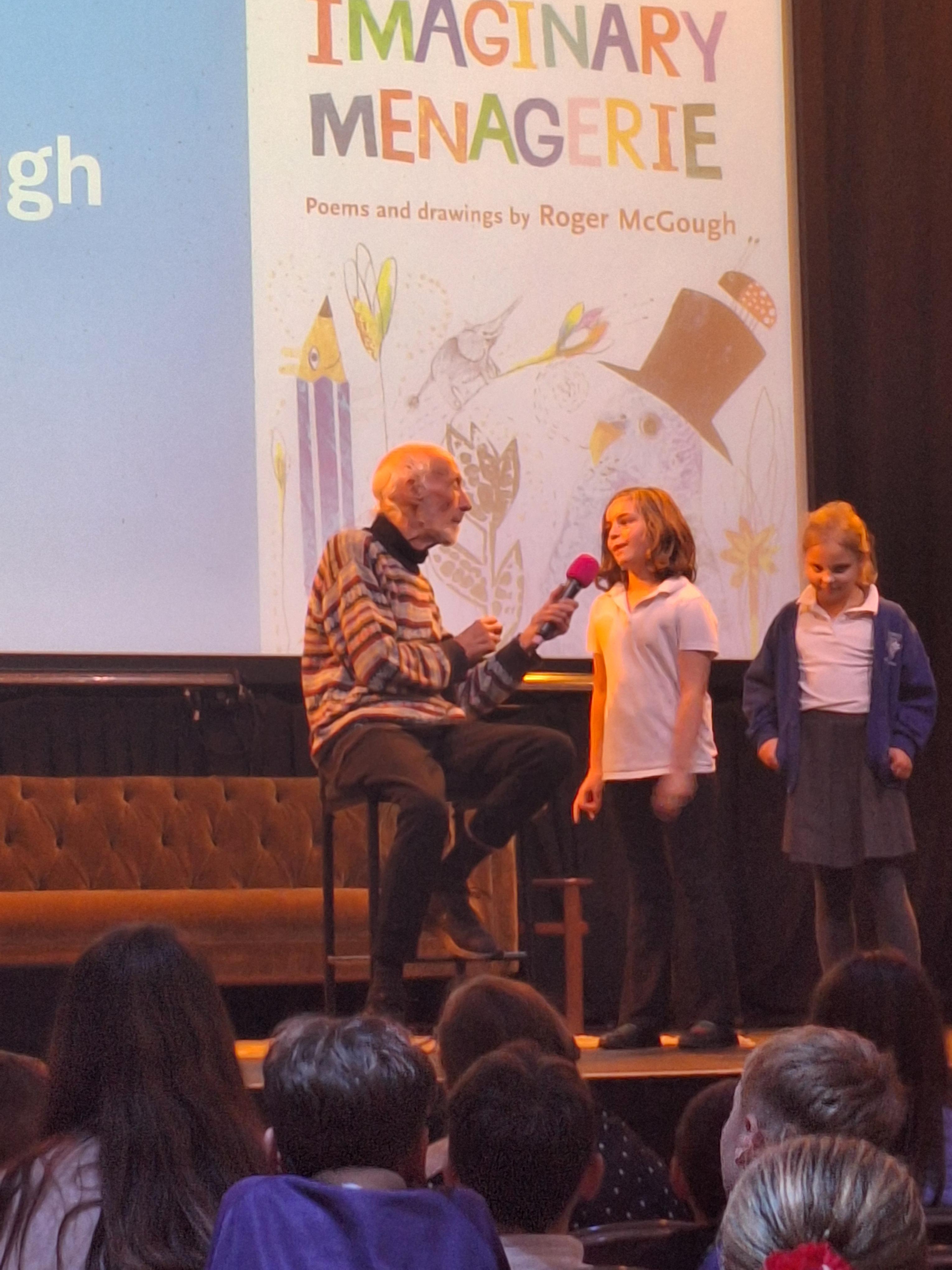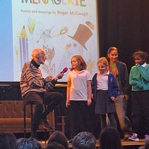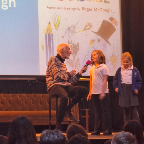 On Thursday, we had a brilliant time at the Book Festival with Roger McGough. The first highlight was when he read The Sound Collector and the Kestrels joined in word for word (proud teacher moment!). The second highlight was Minnie being confident enough to go up on stage with him and recite a poem she had learnt off by heart! Very impressive.