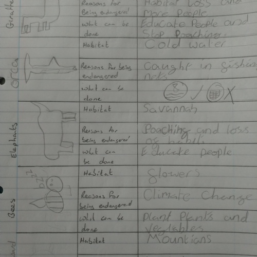 In topic we have been identifying and naming different animals as well as learning about food chains. We learnt about producers, consumers and predators.