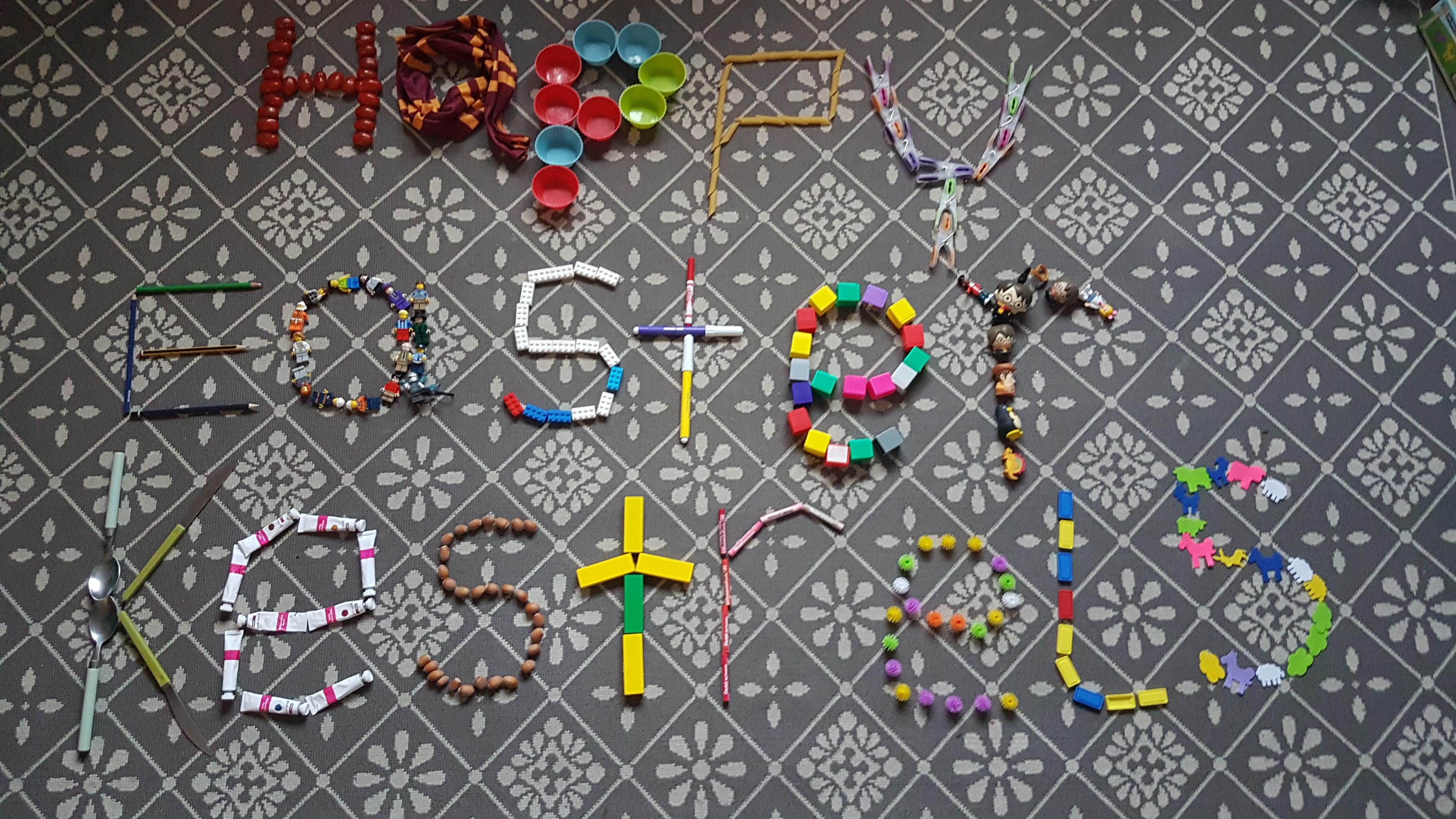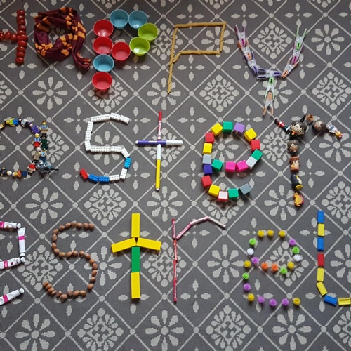 As it's a Friday, I have a Funday Friday challenge for you all! Can you use various household items to spell out a message? My attempt (with a lot of help from George) is below - a little message for you all. It kept George busy for ages (and then he had to do all the tidying up as well!). Send your pictures to us if you complete the challenge and we'll add them to the blog. There's also a fun picture quiz below - can you figure out the films from the block characters?