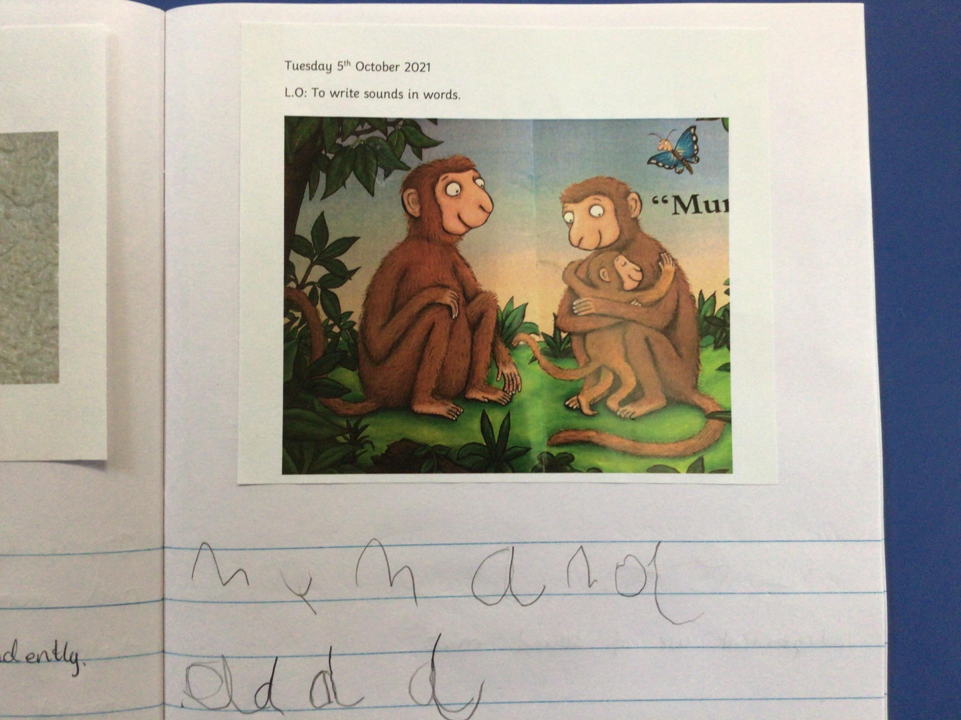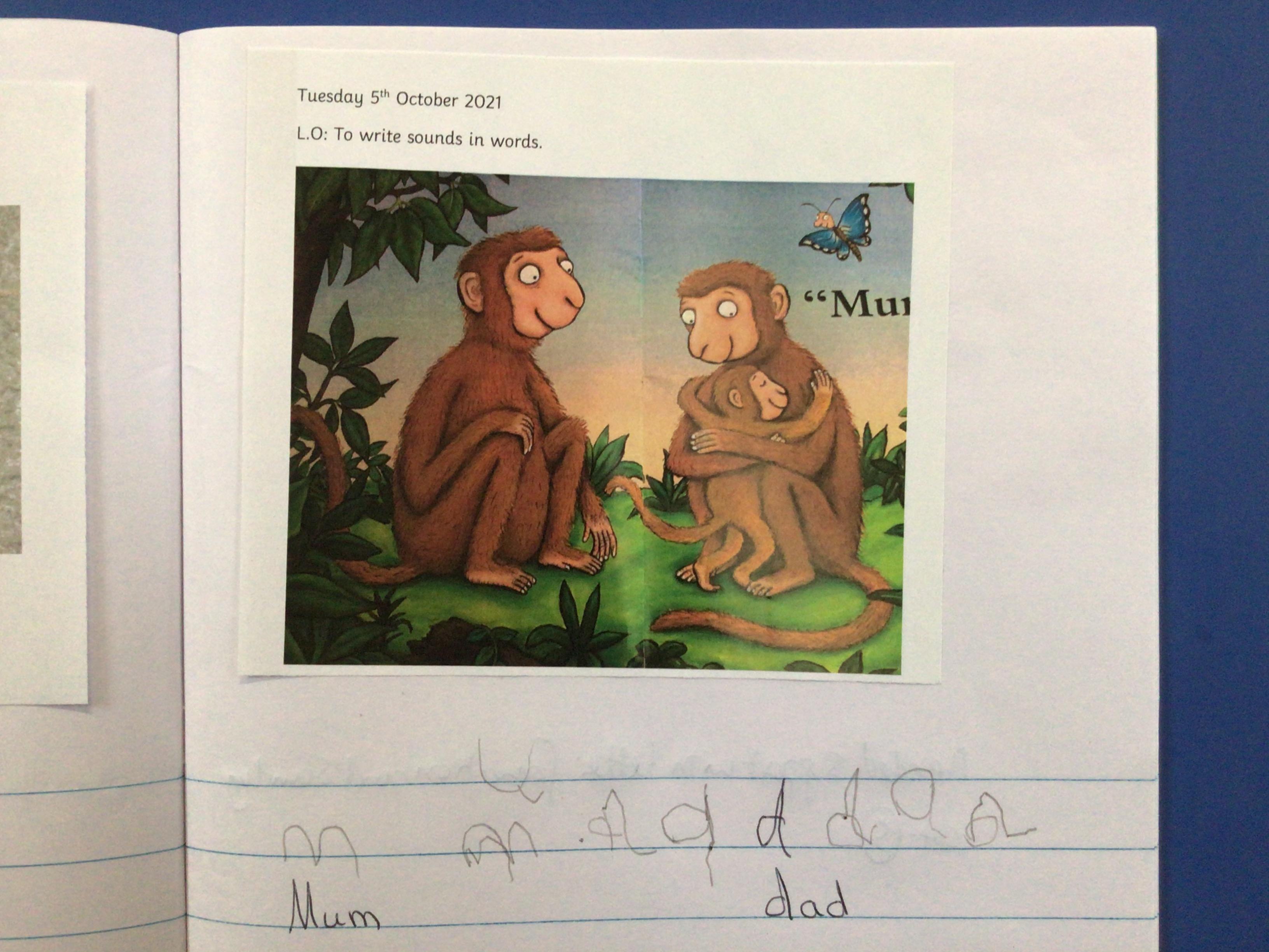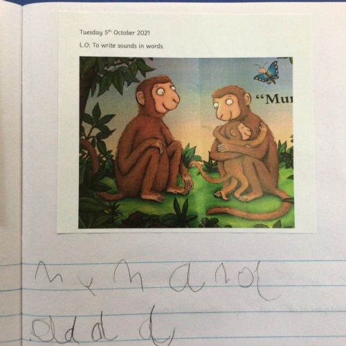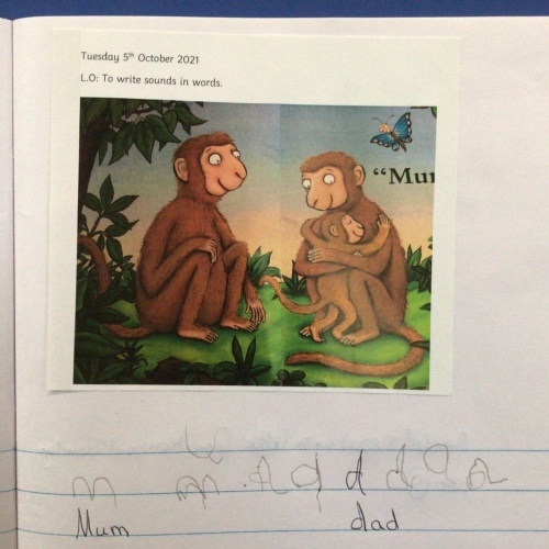 In literacy we have been reading Monkey Puzzle. We have started using the letter sounds that we have been learning to write words and wrote 'mum and dad' this week.