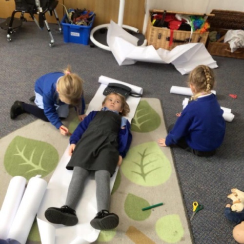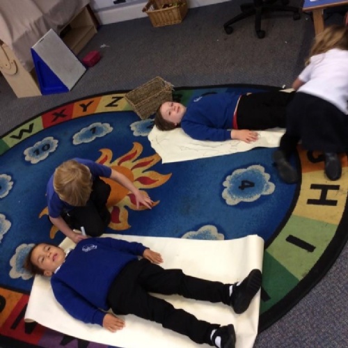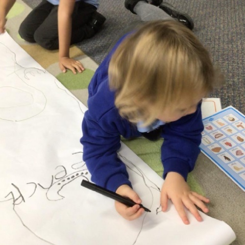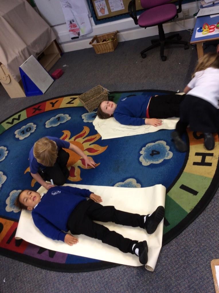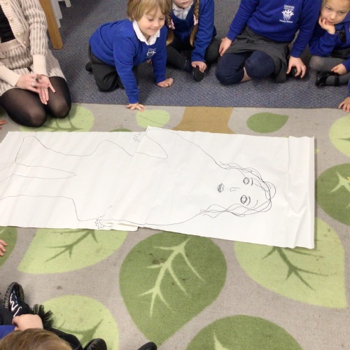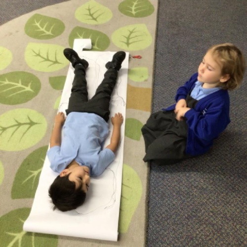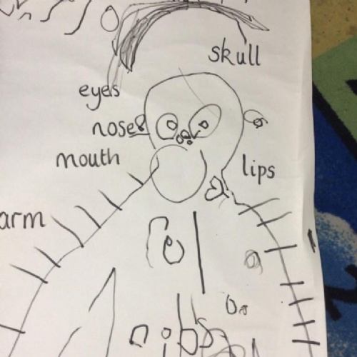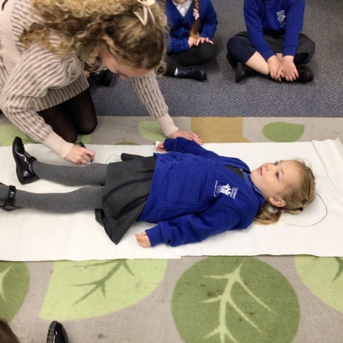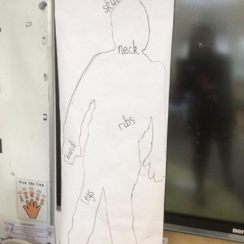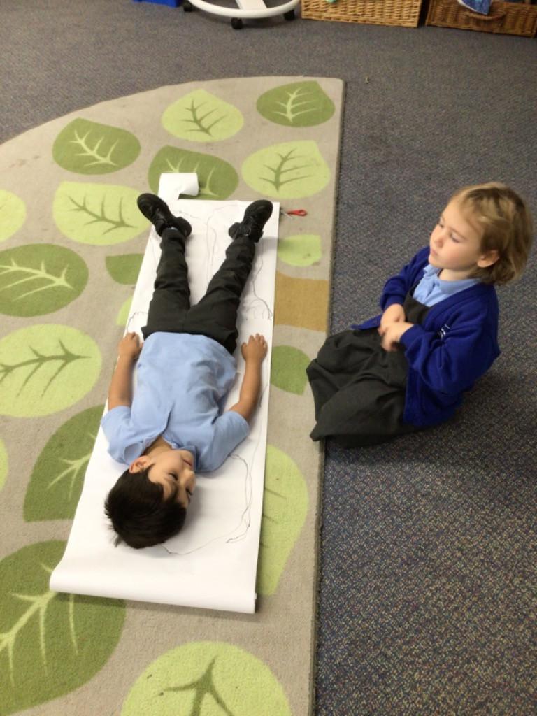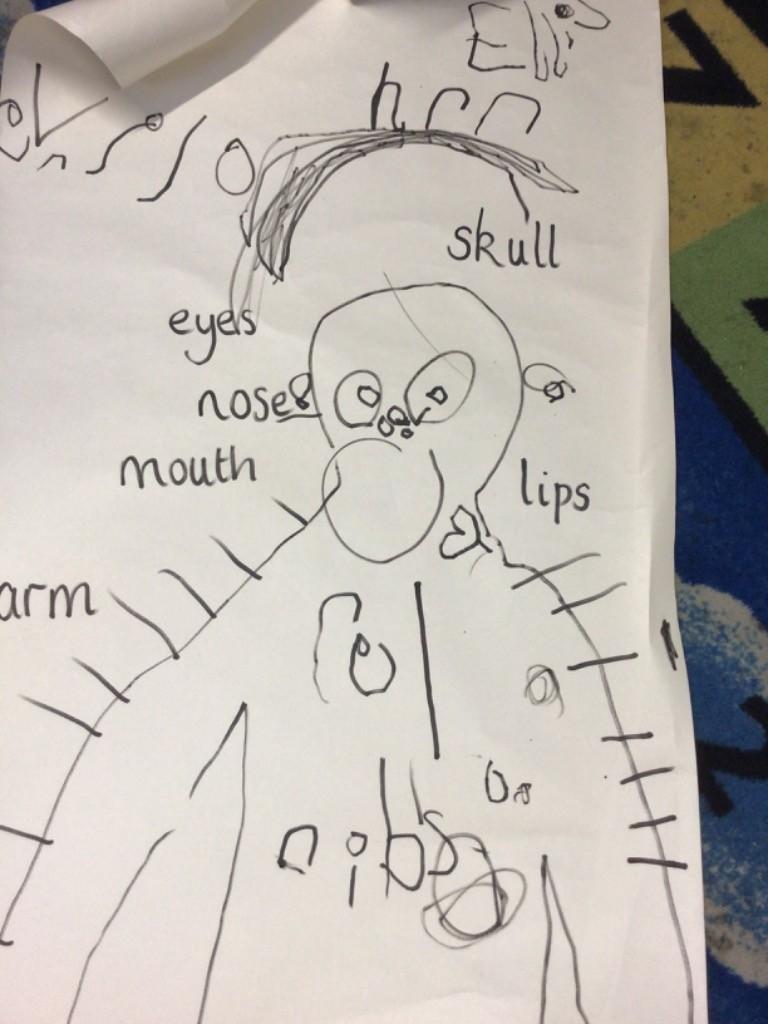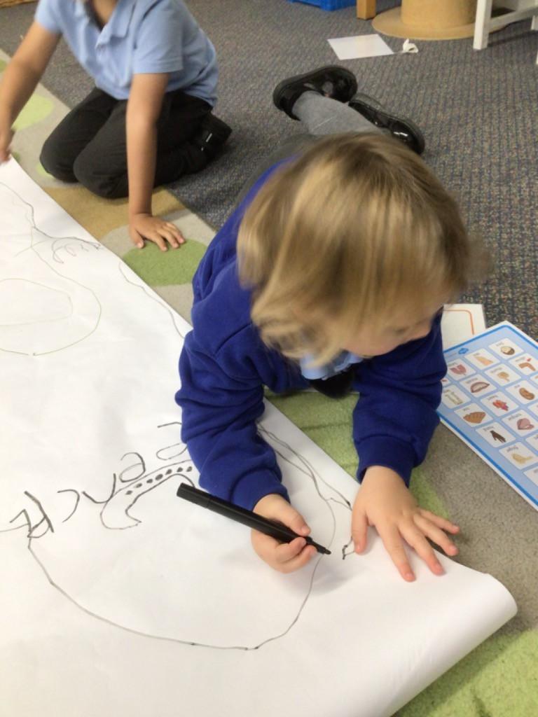We drew around Ellis on large paper and began to label his body as a group. The children directed me to where they wanted me to write to make our ‘labels’. Some children decided to draw more details on afterwards, giving Ellis eyes and a smile! Some children used their phonic knowledge to begin to label with a little support, eg ‘ribs’ and ‘hr’ (hair) and ‘maf’ (mouth).