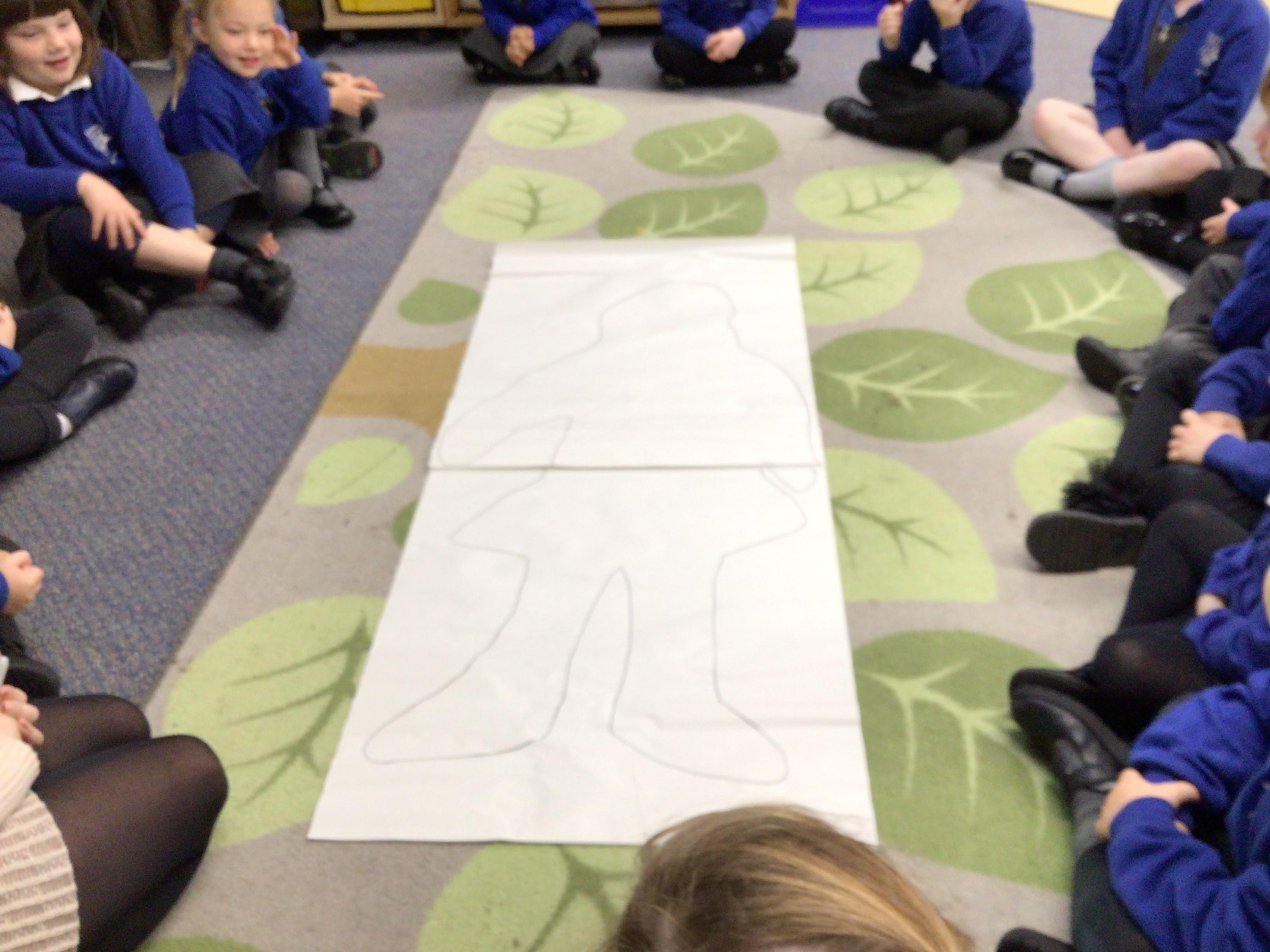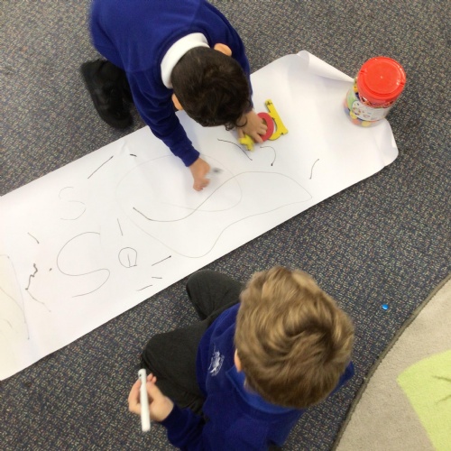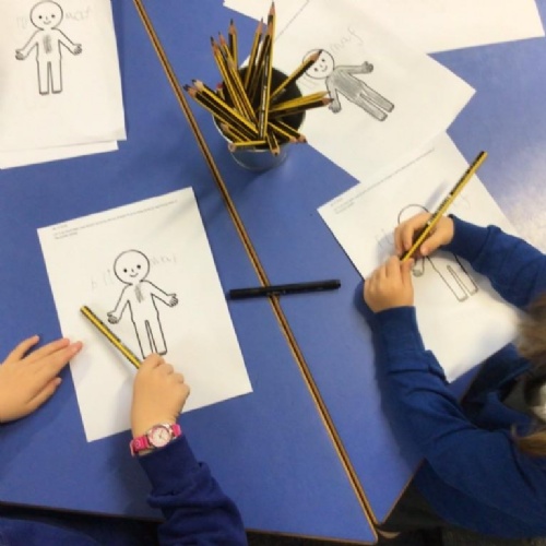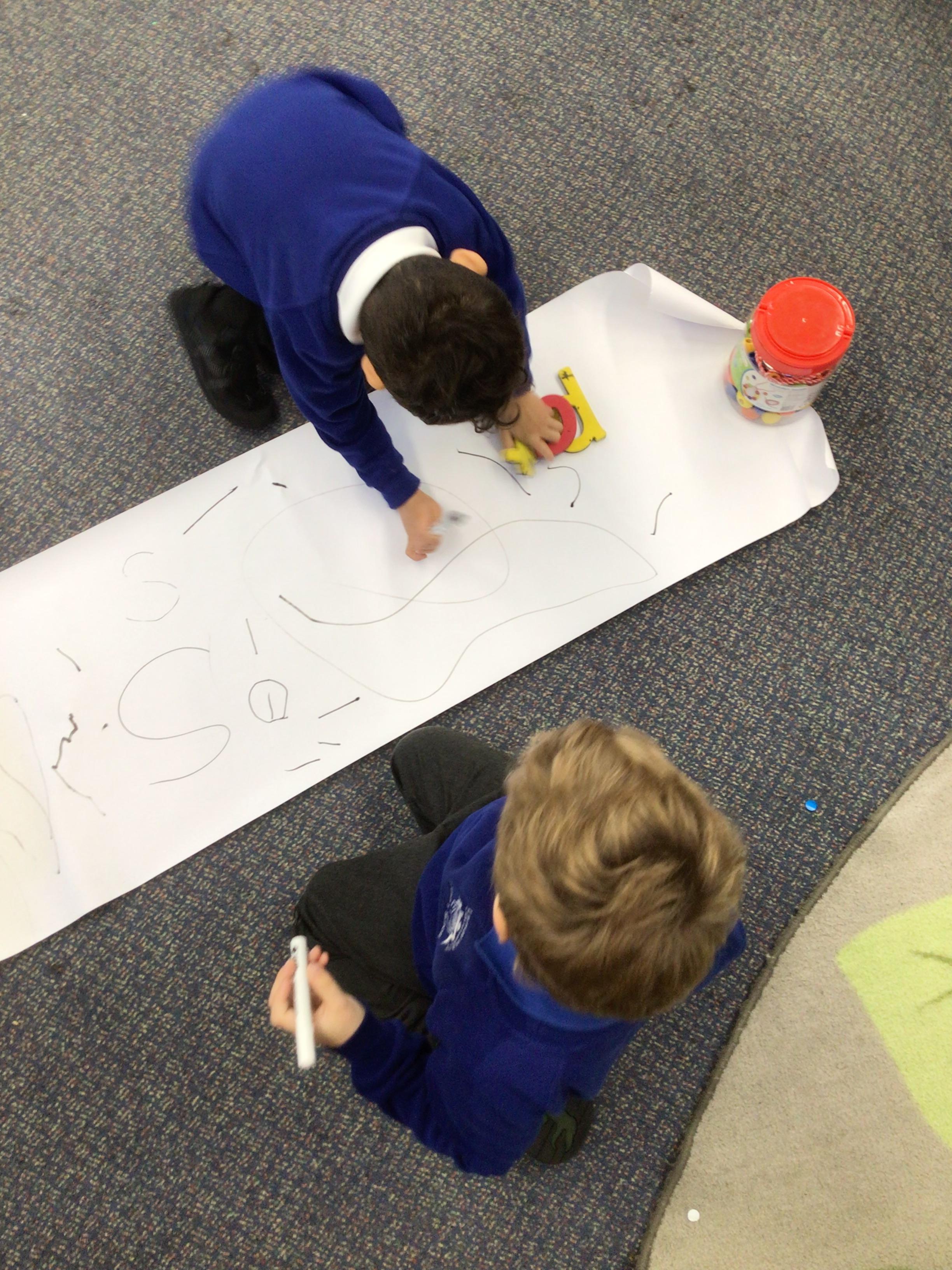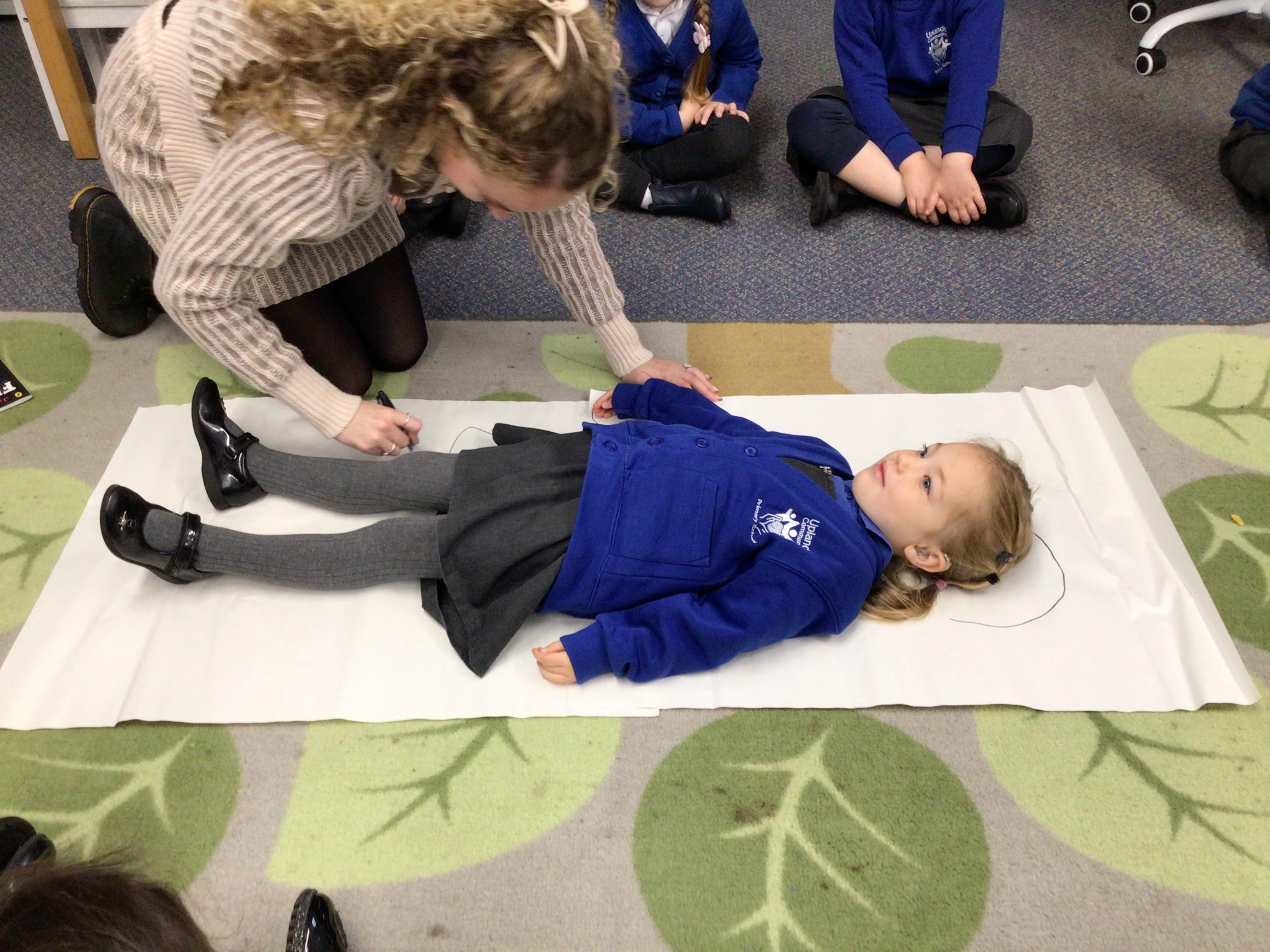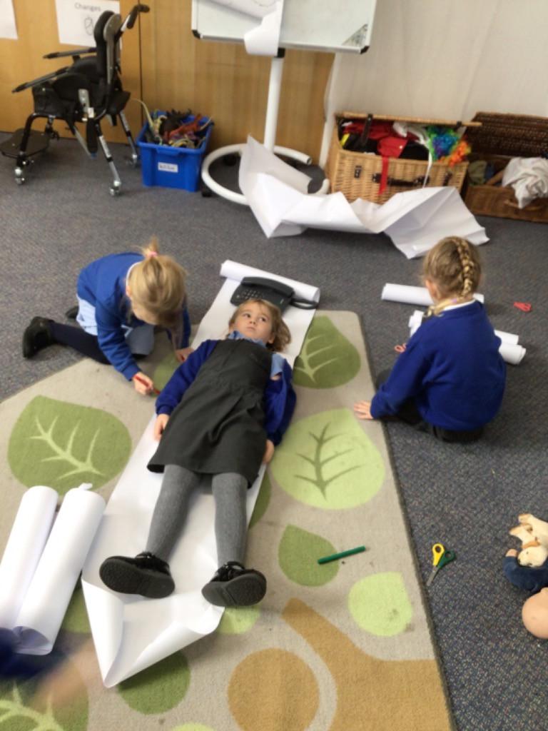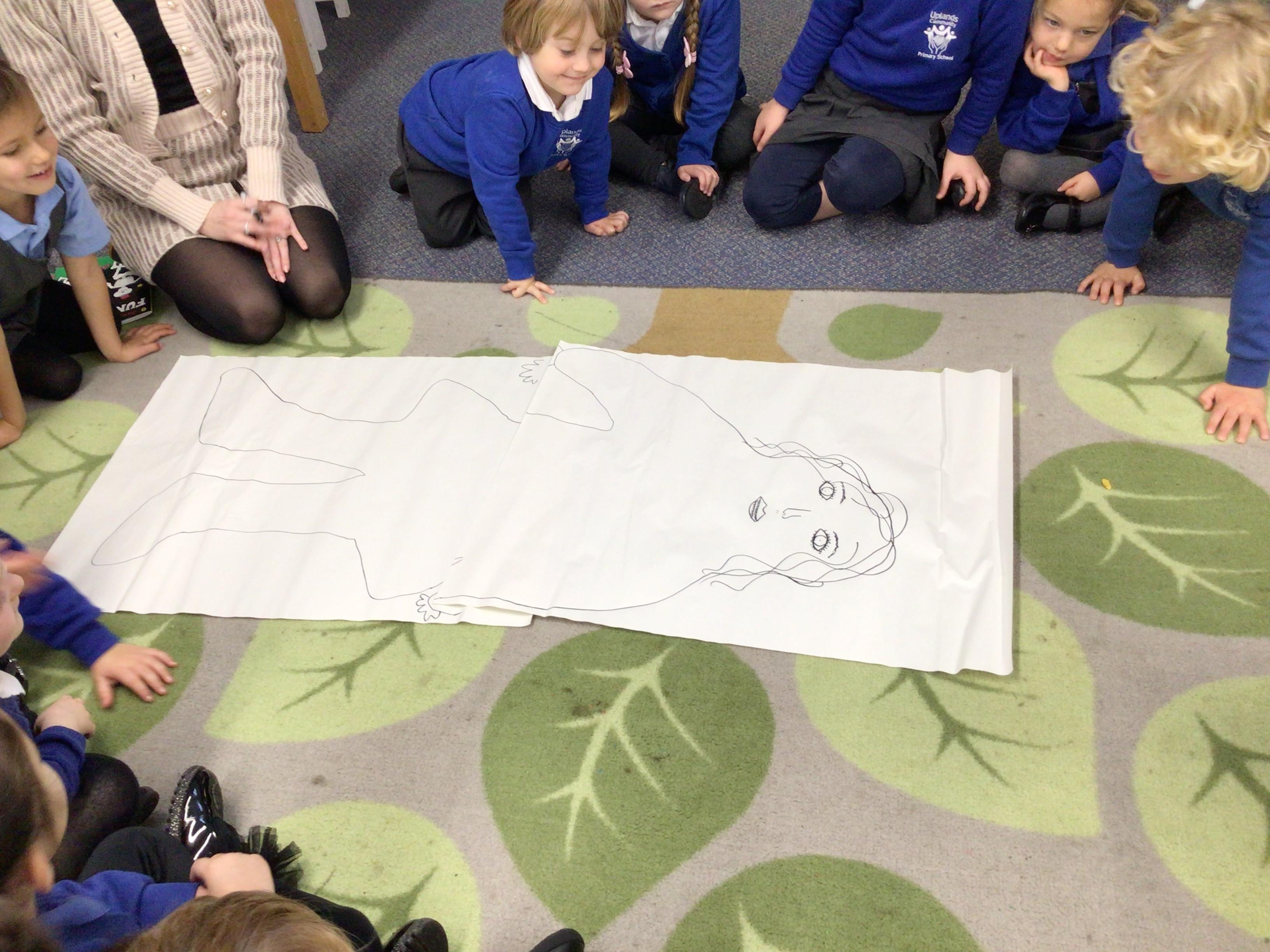 We drew around Ellis on large paper and began to label his body as a group. The children directed me to where they wanted me to write to make our ‘labels’. Some children decided to draw more details on afterwards, giving Ellis eyes and a smile! Some children used their phonic knowledge to begin to label with a little support, eg ‘ribs’ and ‘hr’ (hair) and ‘maf’ (mouth).