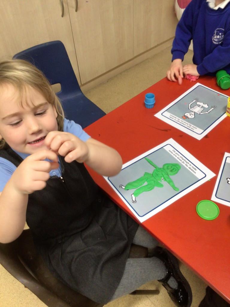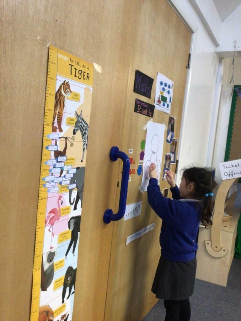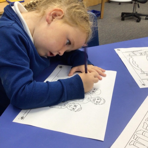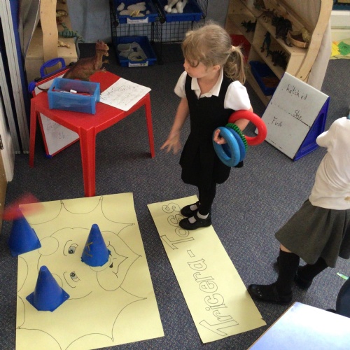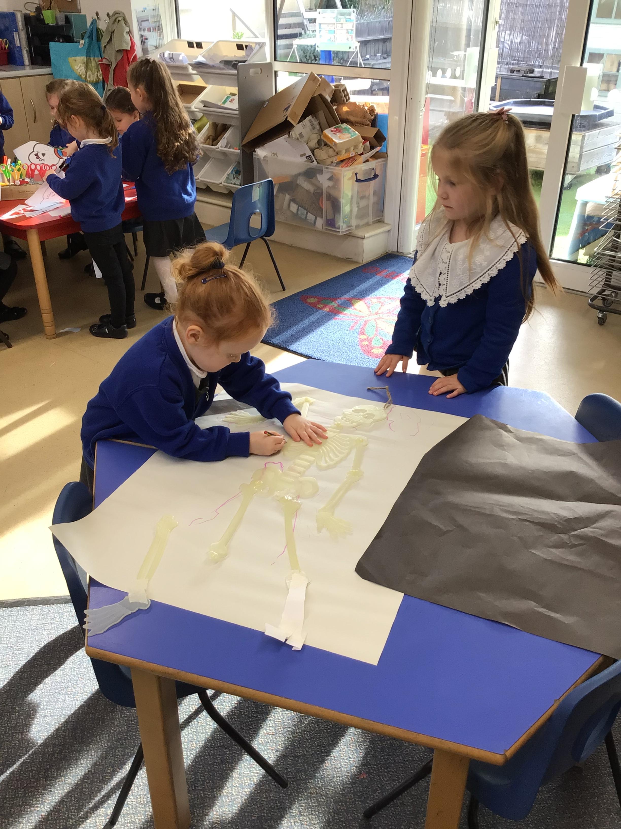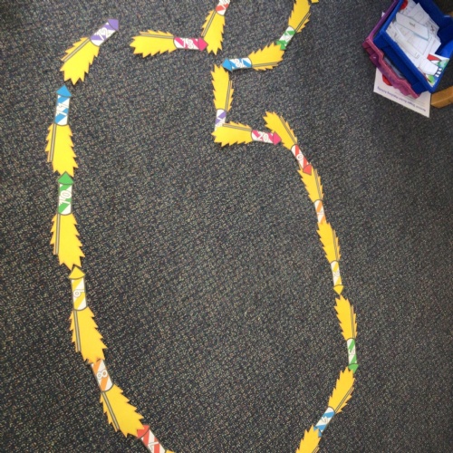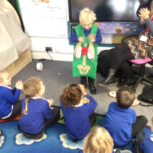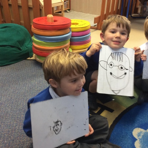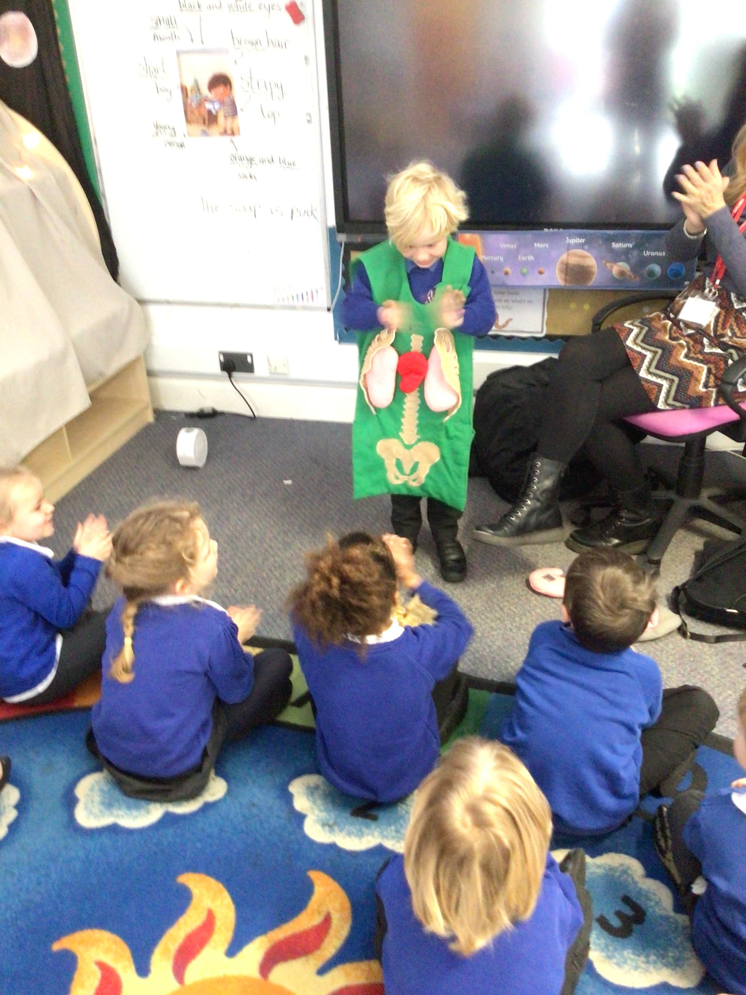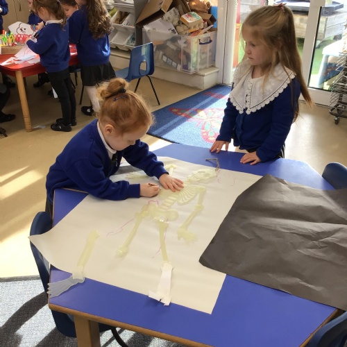 We drew around Ellis on large paper and began to label his body as a group. The children directed me to where they wanted me to write to make our ‘labels’. Some children decided to draw more details on afterwards, giving Ellis eyes and a smile! Some children used their phonic knowledge to begin to label with a little support, eg ‘ribs’ and ‘hr’ (hair) and ‘maf’ (mouth).