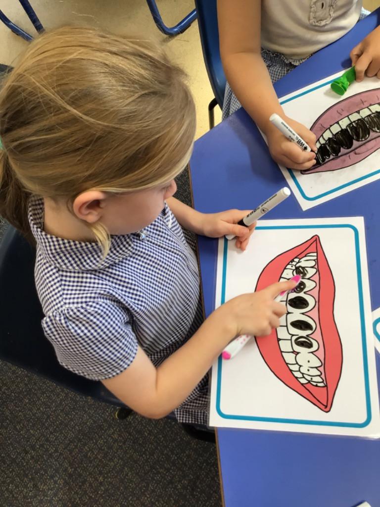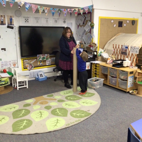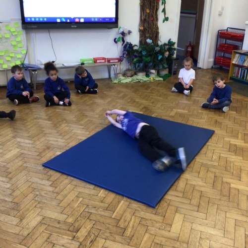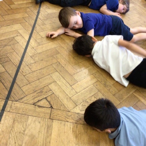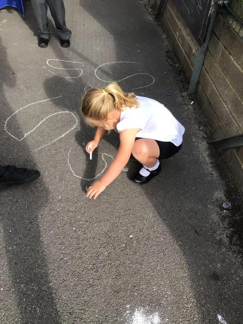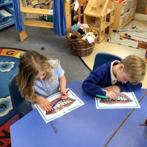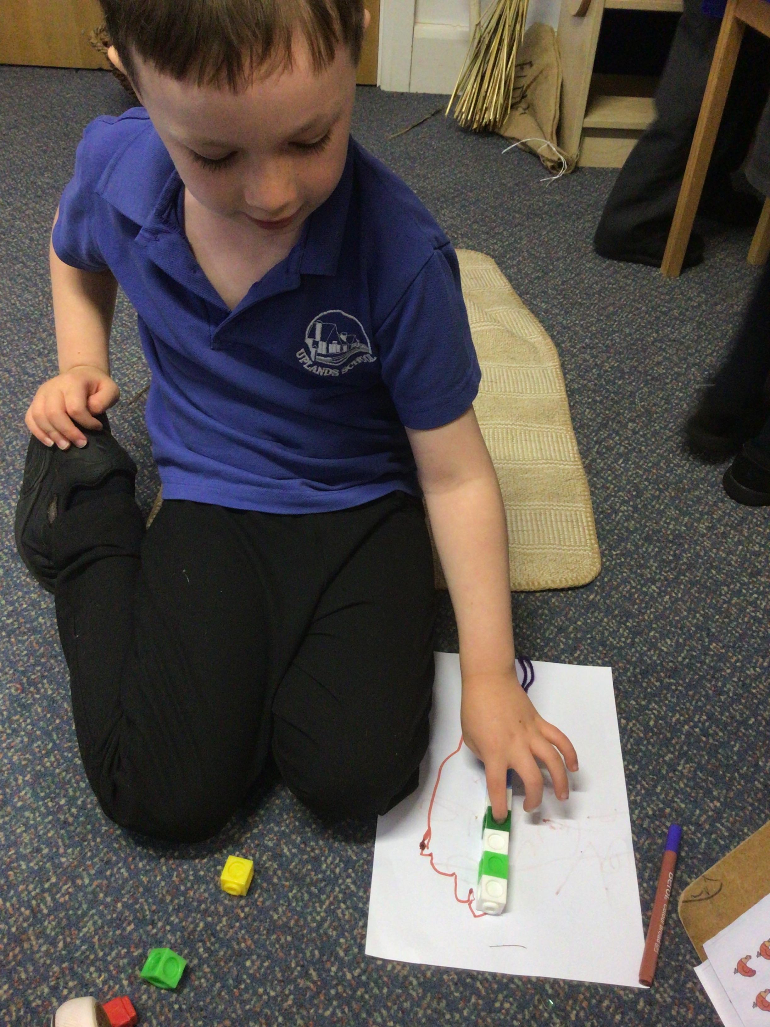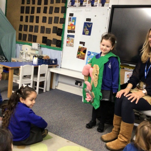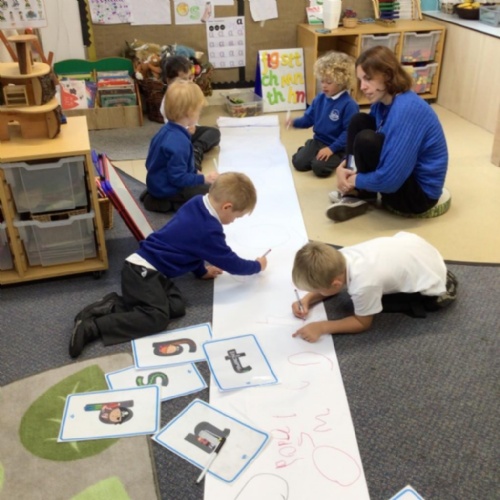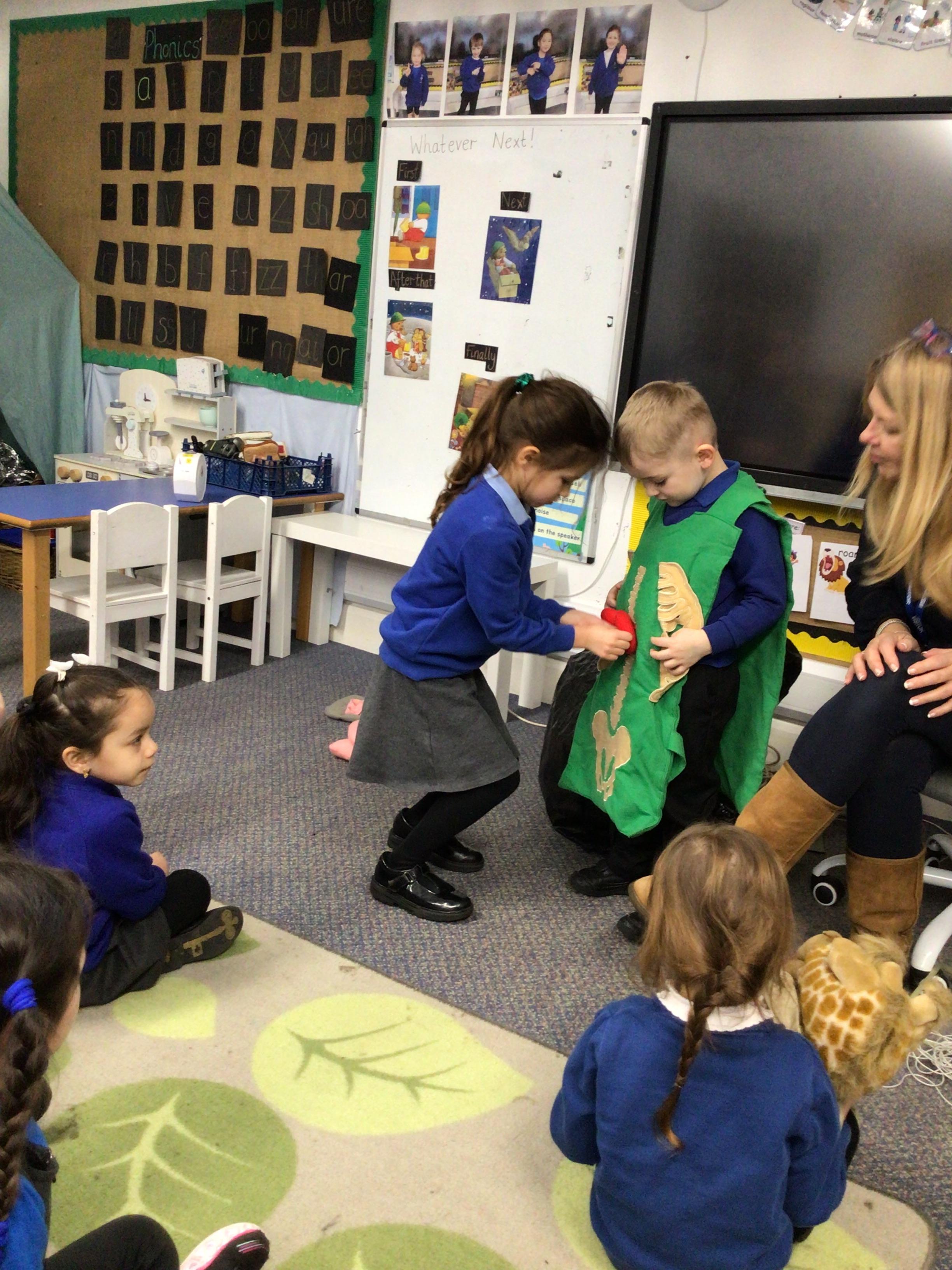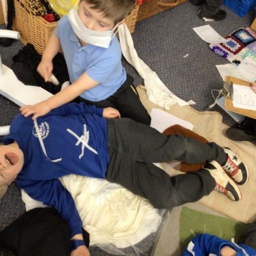 We drew around Ellis on large paper and began to label his body as a group. The children directed me to where they wanted me to write to make our ‘labels’. Some children decided to draw more details on afterwards, giving Ellis eyes and a smile! Some children used their phonic knowledge to begin to label with a little support, eg ‘ribs’ and ‘hr’ (hair) and ‘maf’ (mouth).
