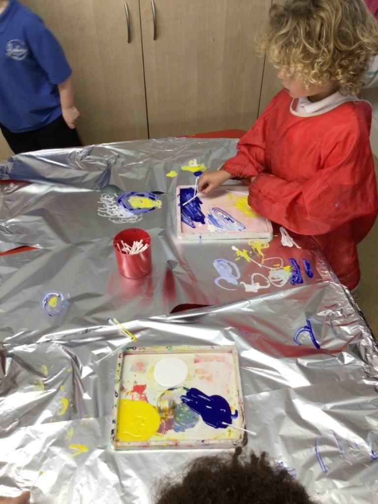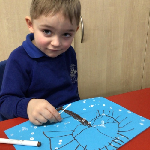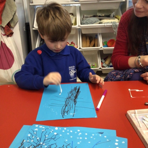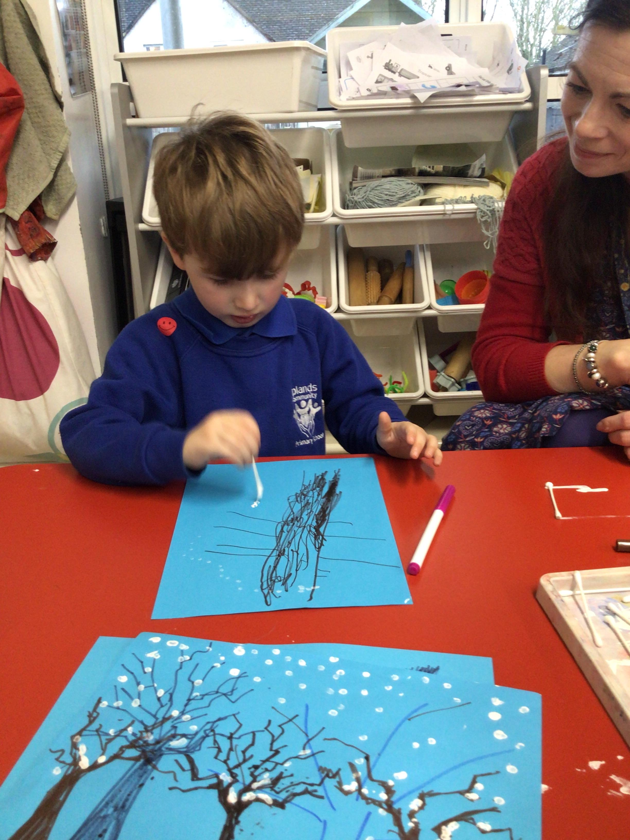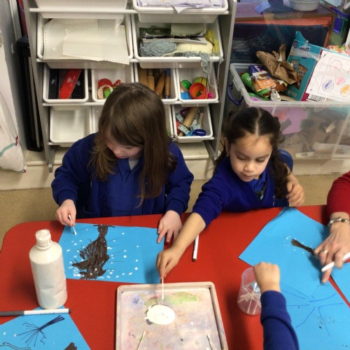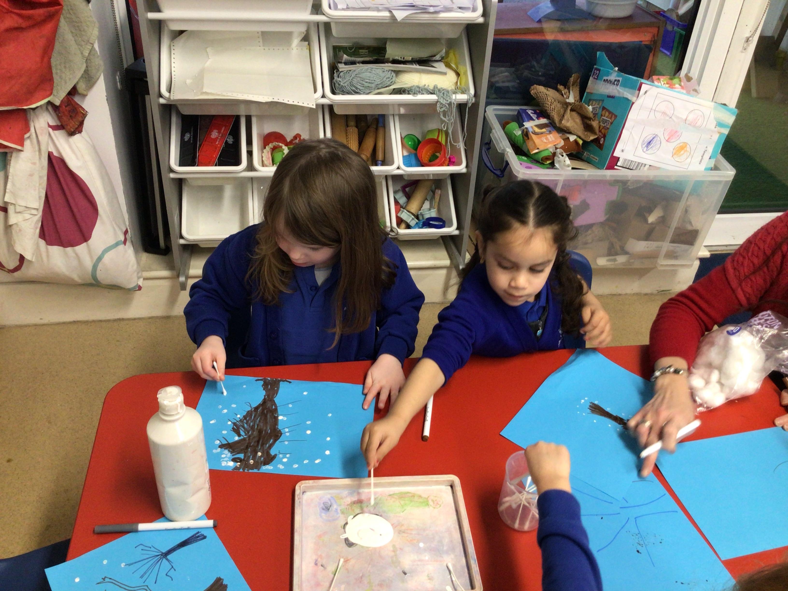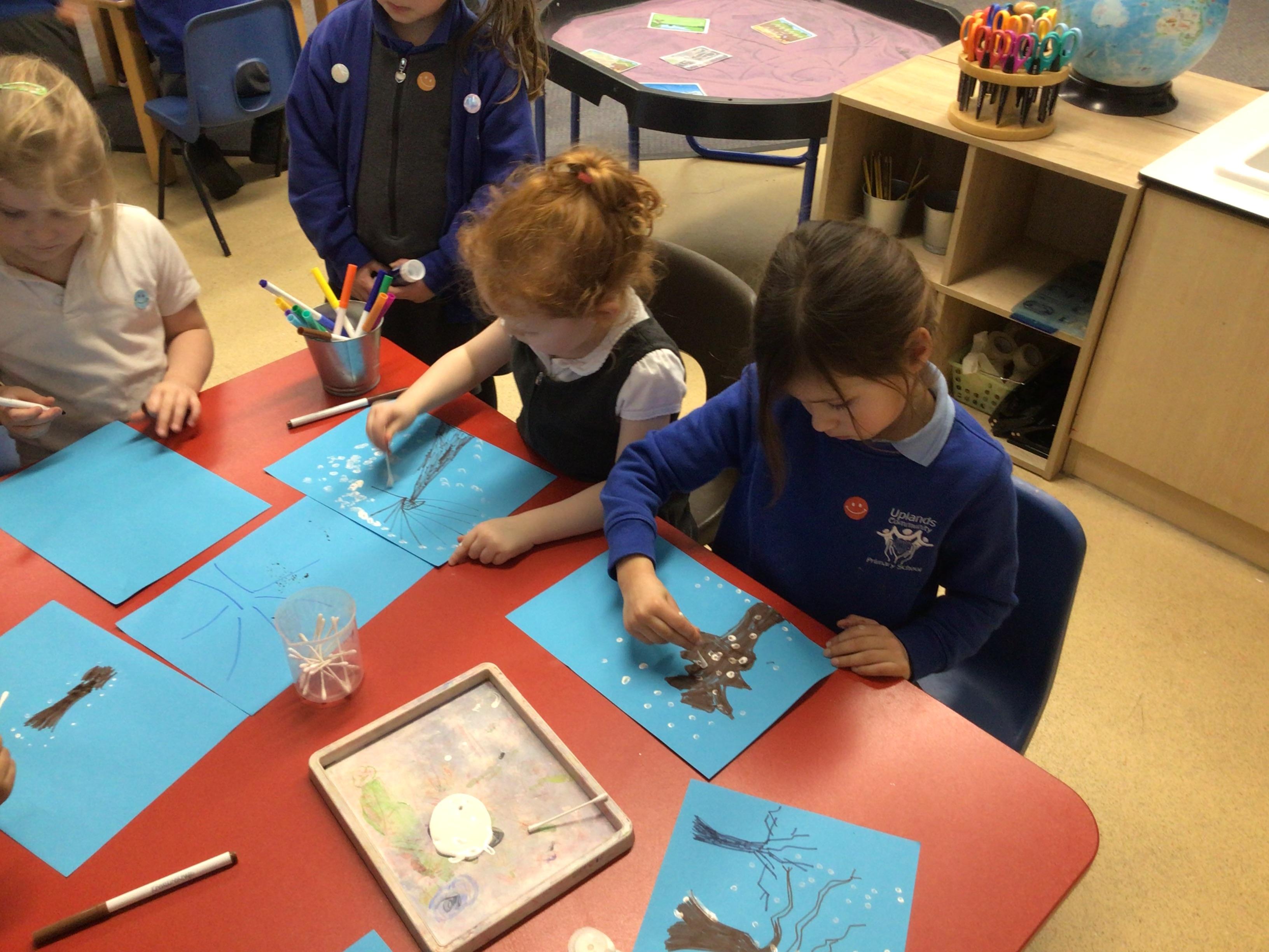- In Art we have created a winter painting using cotton buds and pens