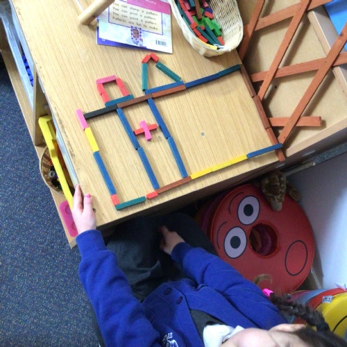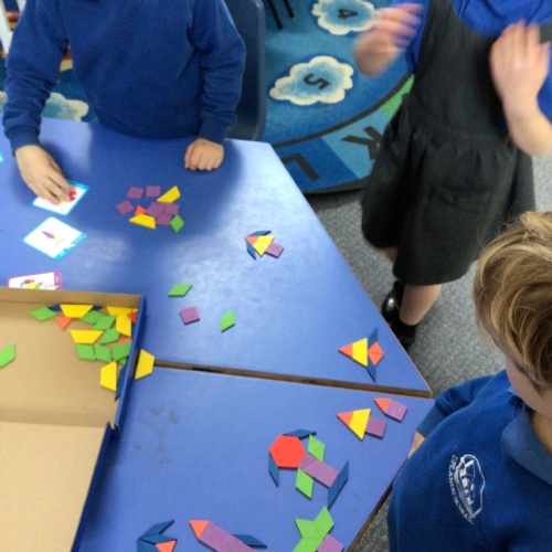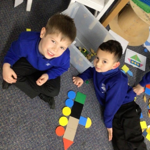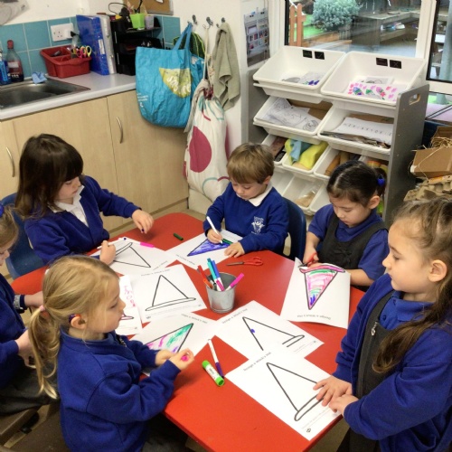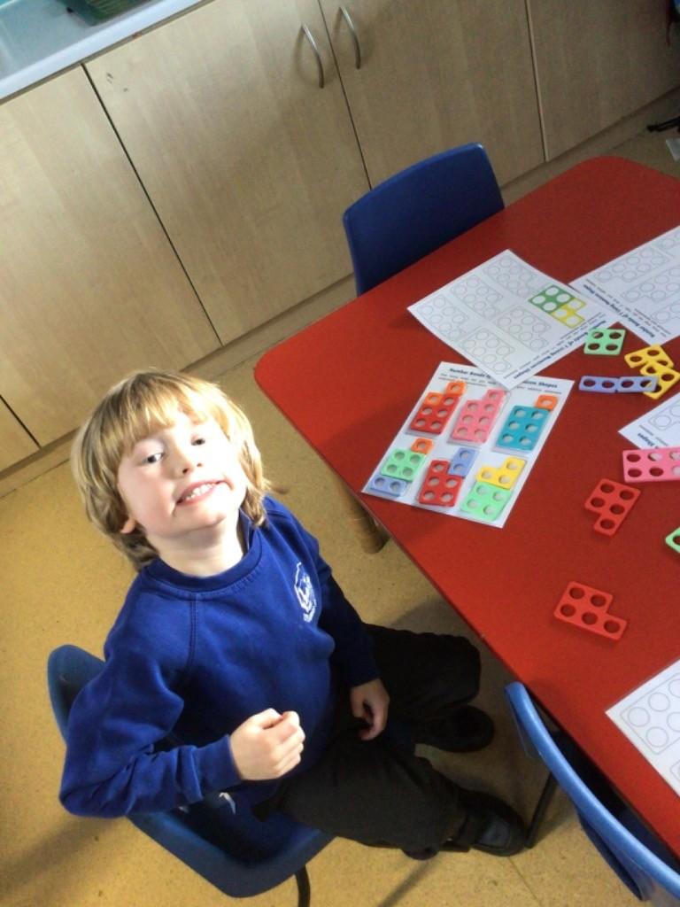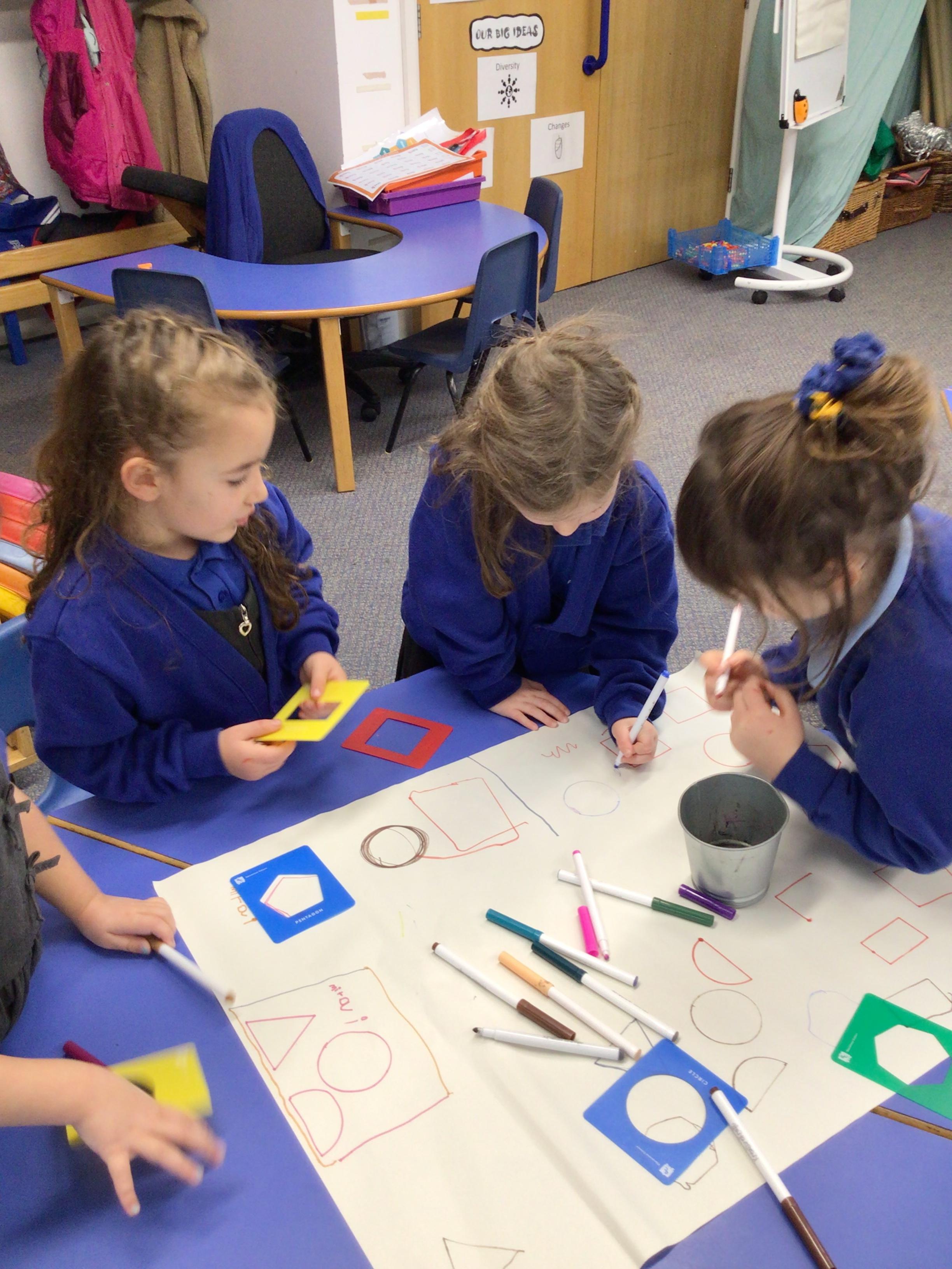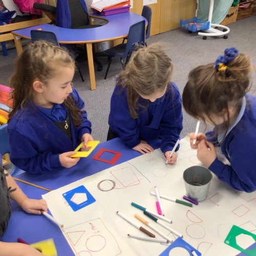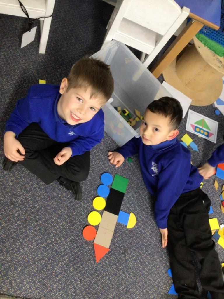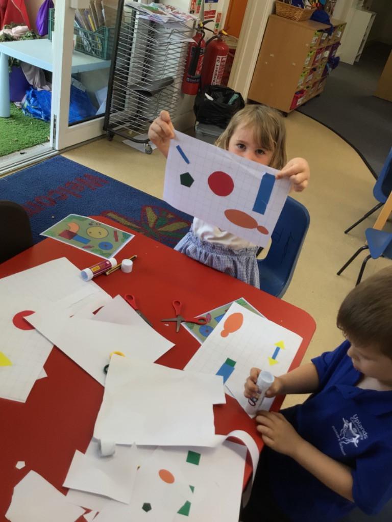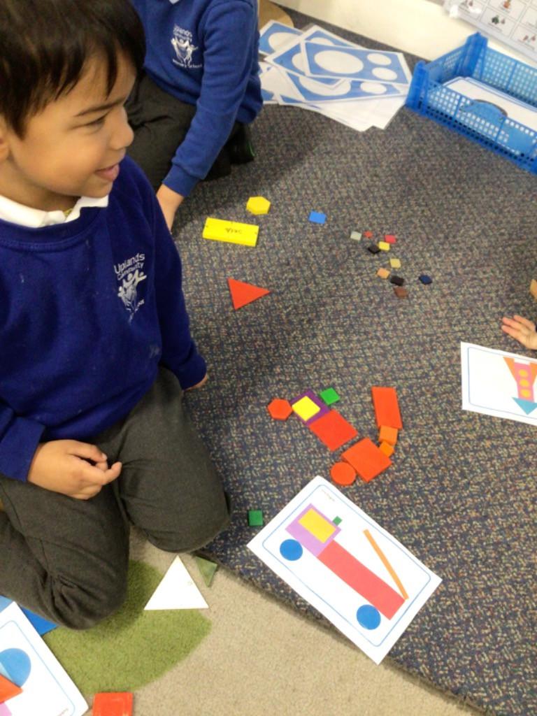 In maths we have been exploring 2D shape. We have been able to talk about different shapes using the words 'straight, curved and sides'. We have also really enjoyed playing with the shapes and exploring their properties.