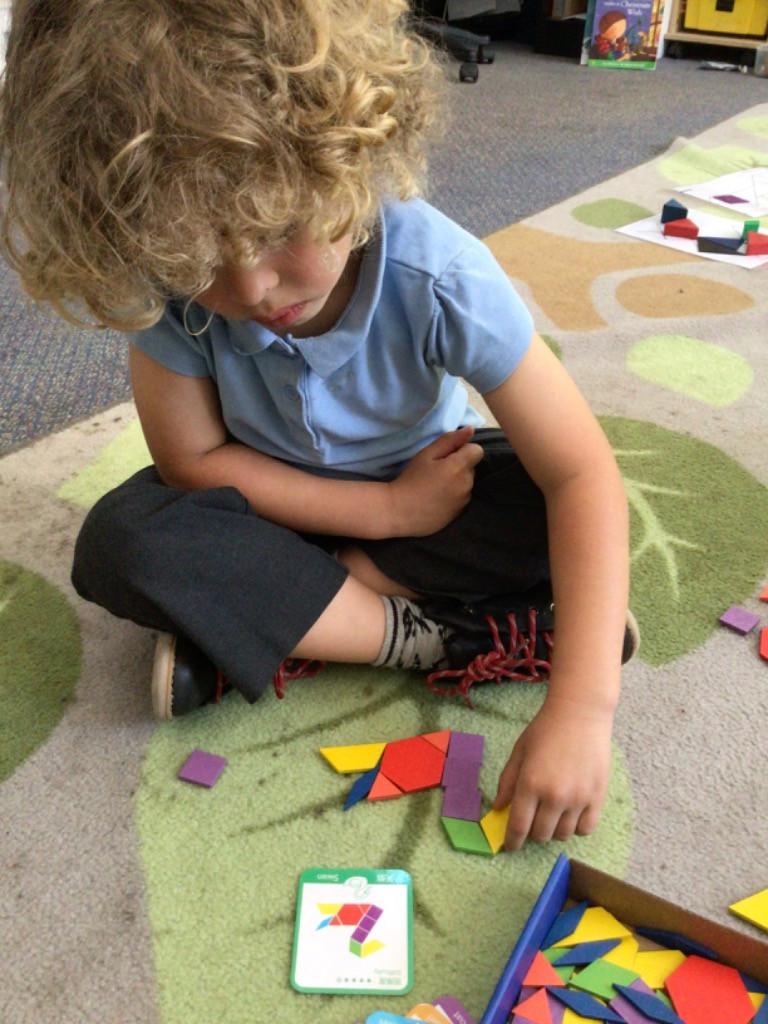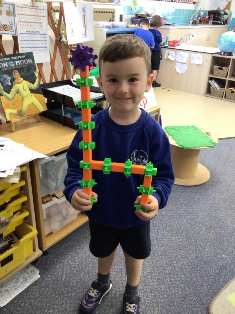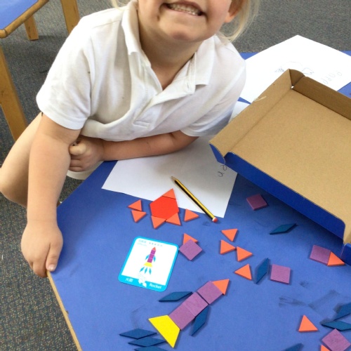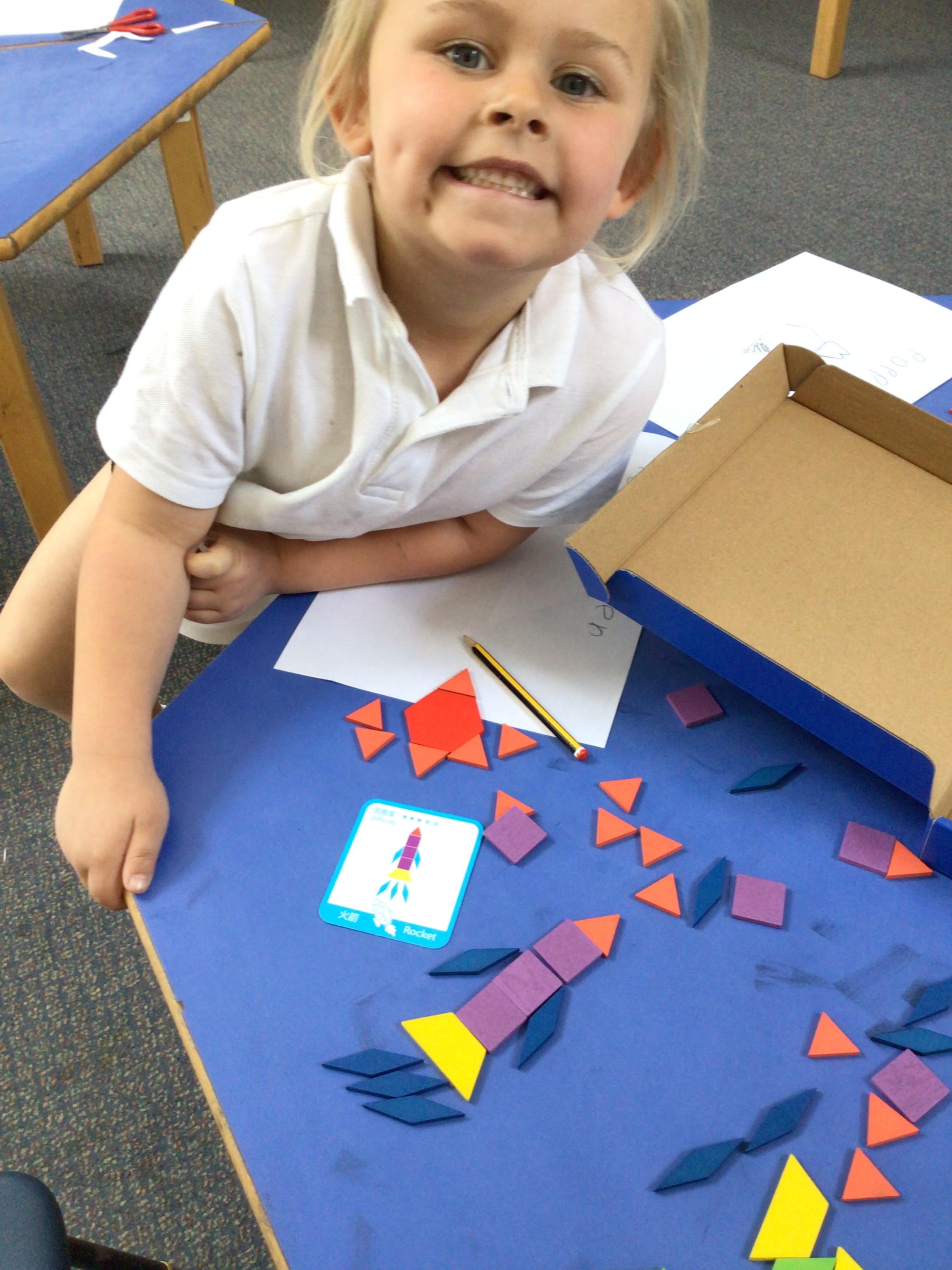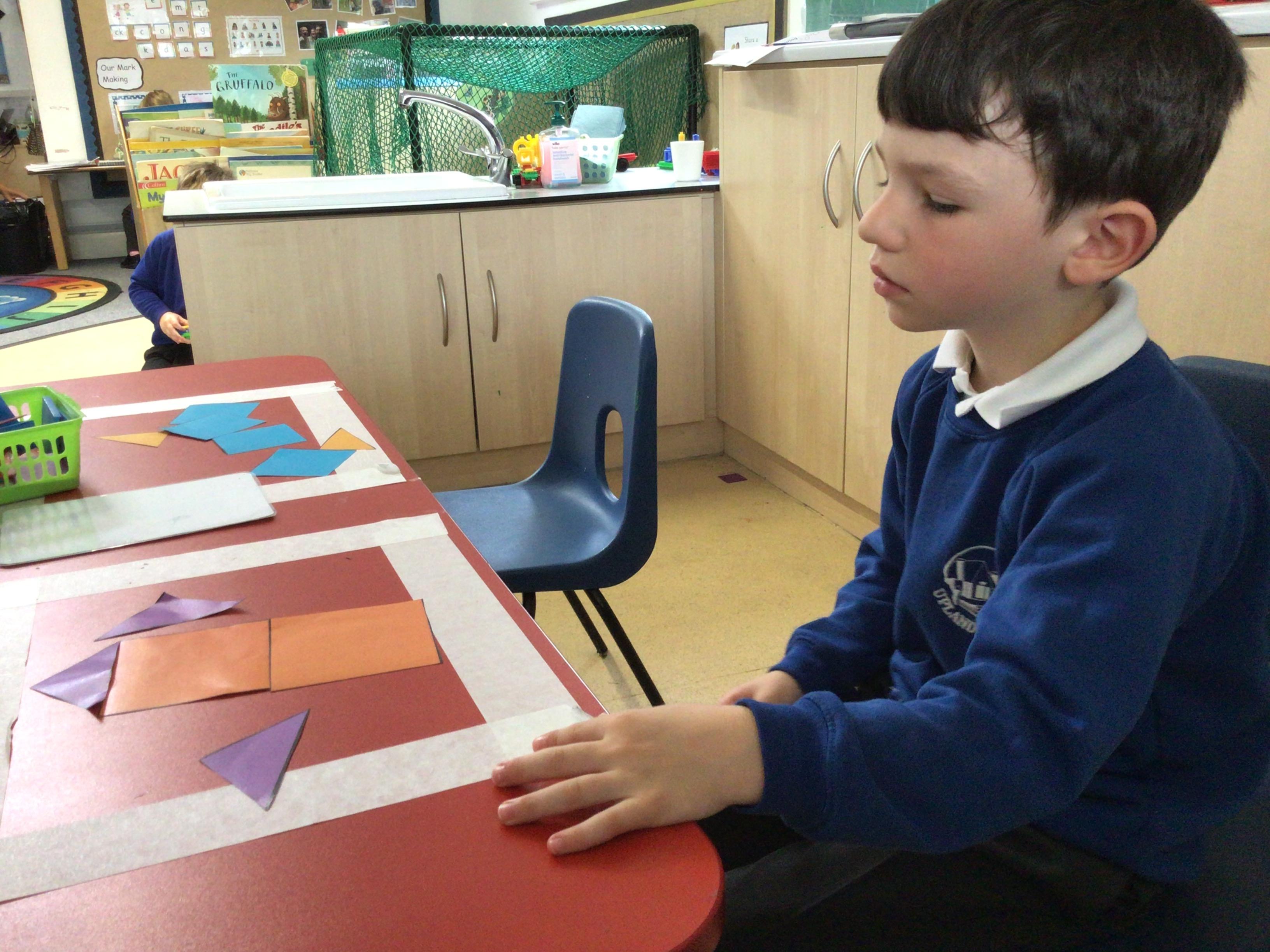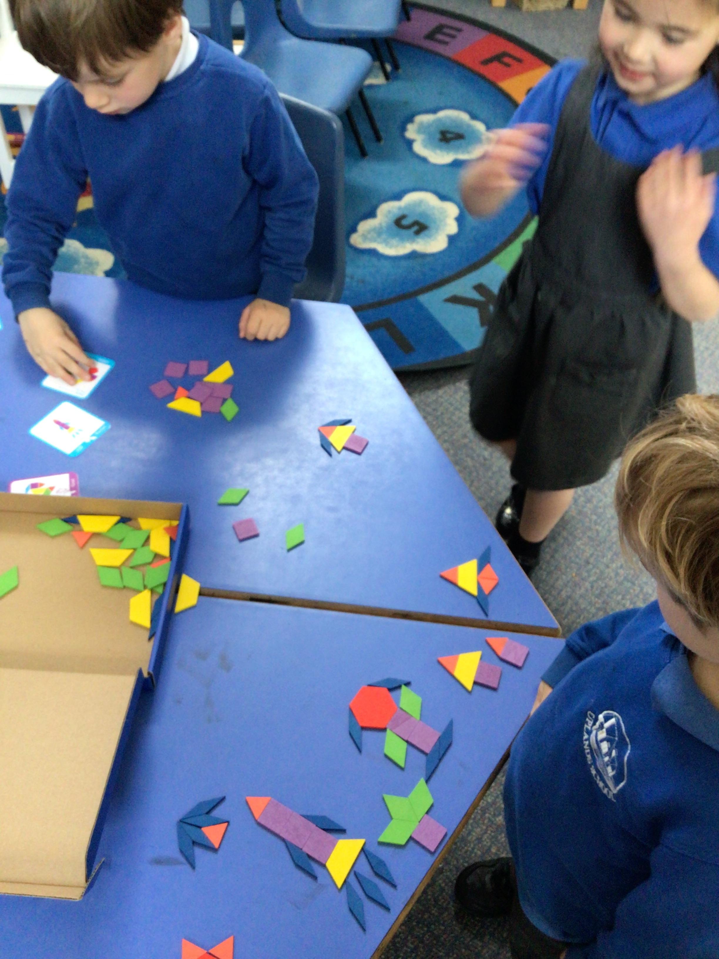 In maths we have been exploring 2D shape. We have been able to talk about different shapes using the words 'straight, curved and sides'. We have also really enjoyed playing with the shapes and exploring their properties.