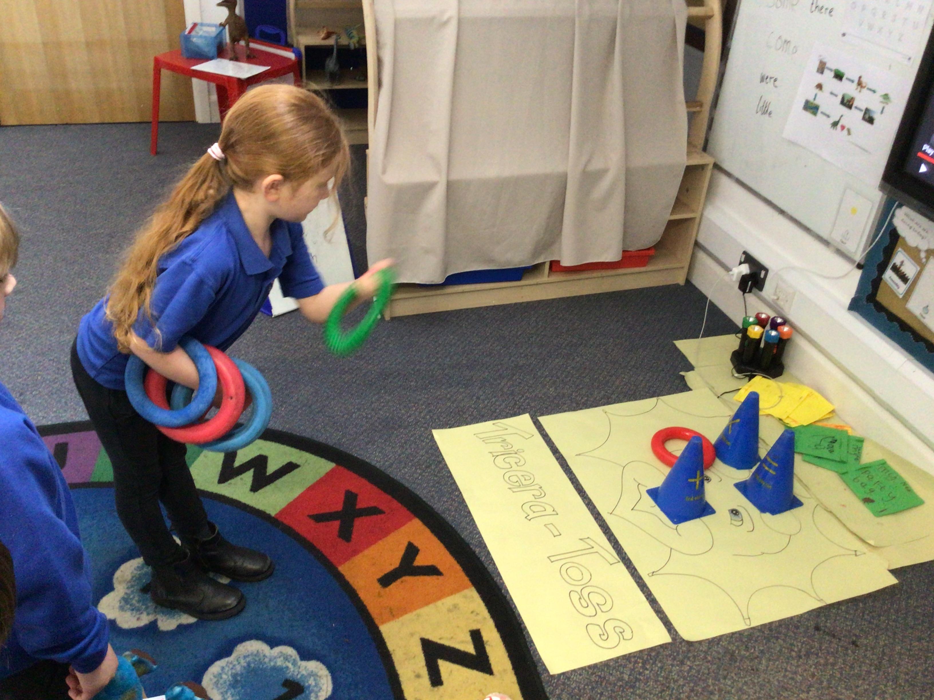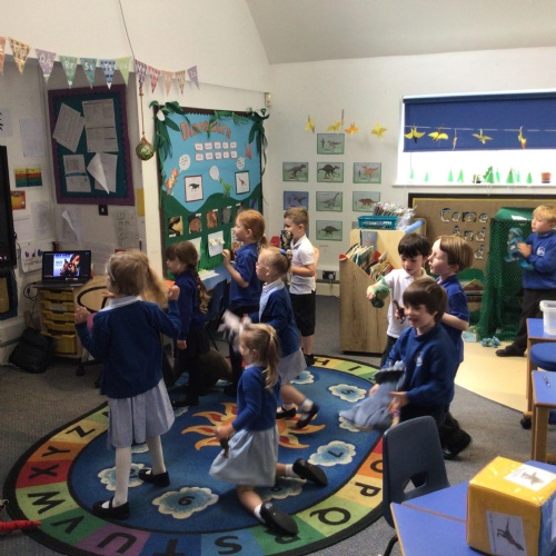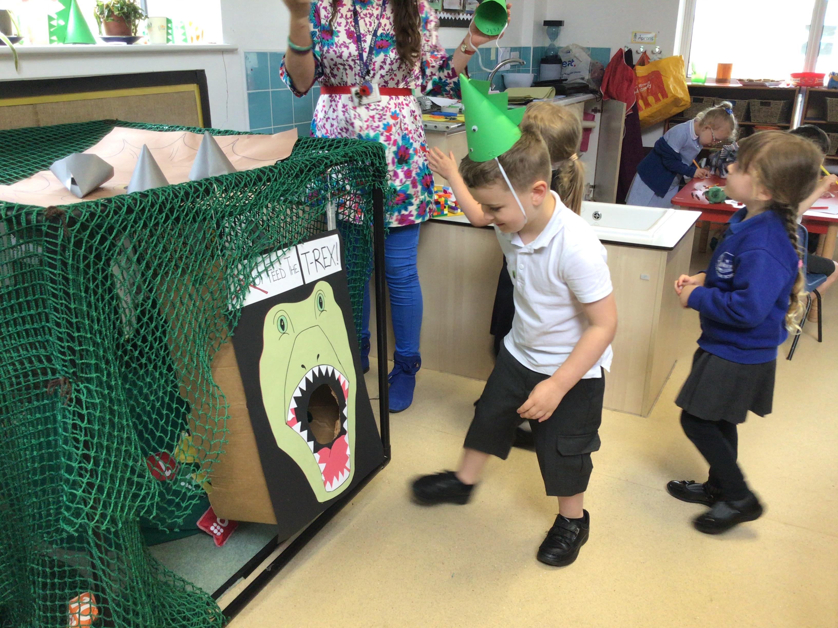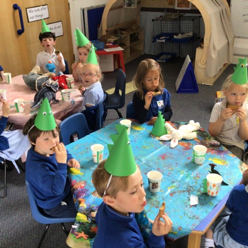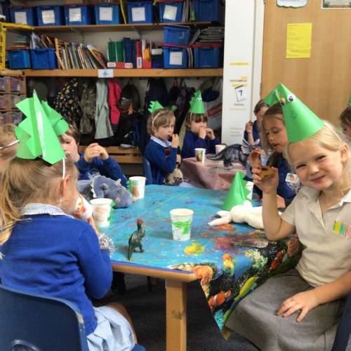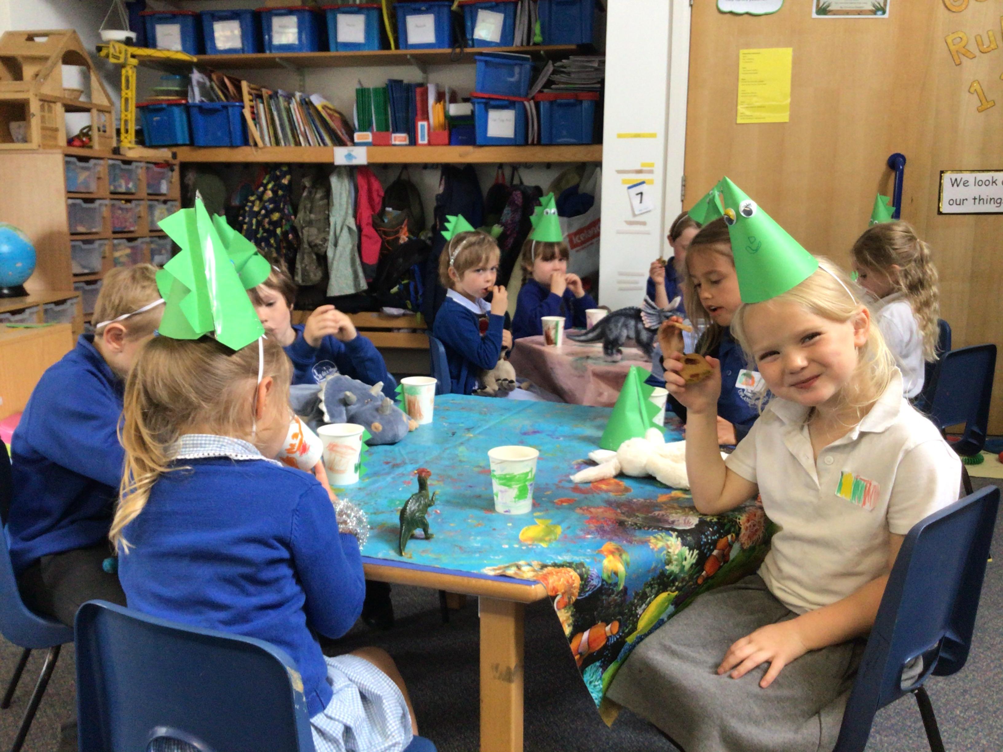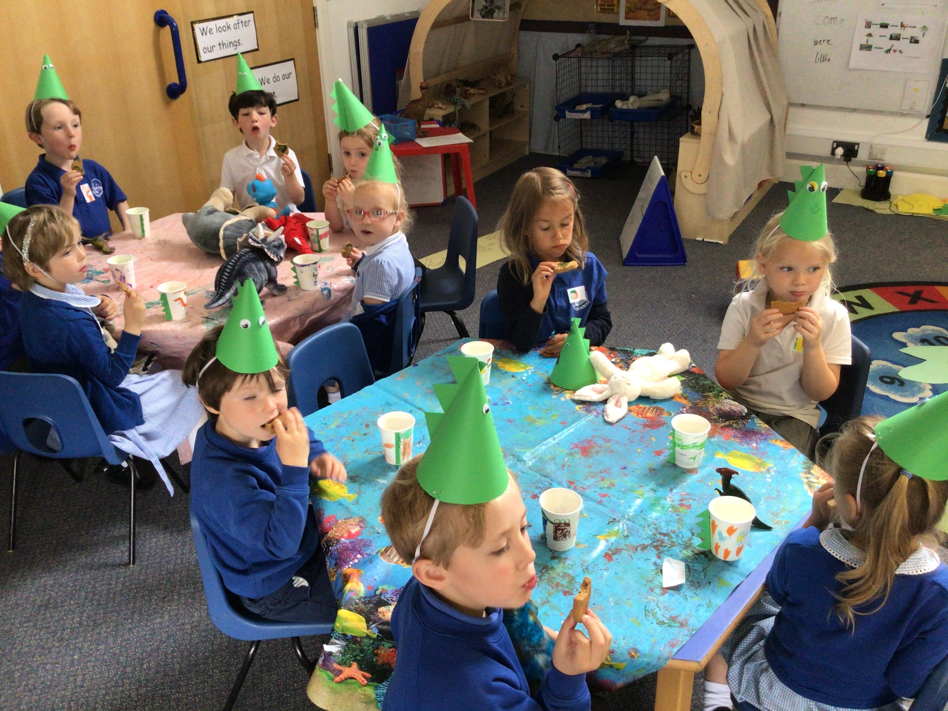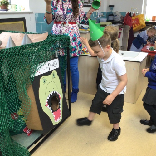 This week we have been reading the book 'Saturday Night at the Dinosaur Stomp'. It has inspired us to have our own 'stomp'. In preparation, we have written invitations to our own dinosaurs, made biscuits and party hats.Today we have held the 'stomp'. We have drunk swamp juice, eaten biscuits and played musical dinosaurs. We had some brilliant games to play ( thank you Mrs Day-Lewis), including a 'Tricera-Toss'.
