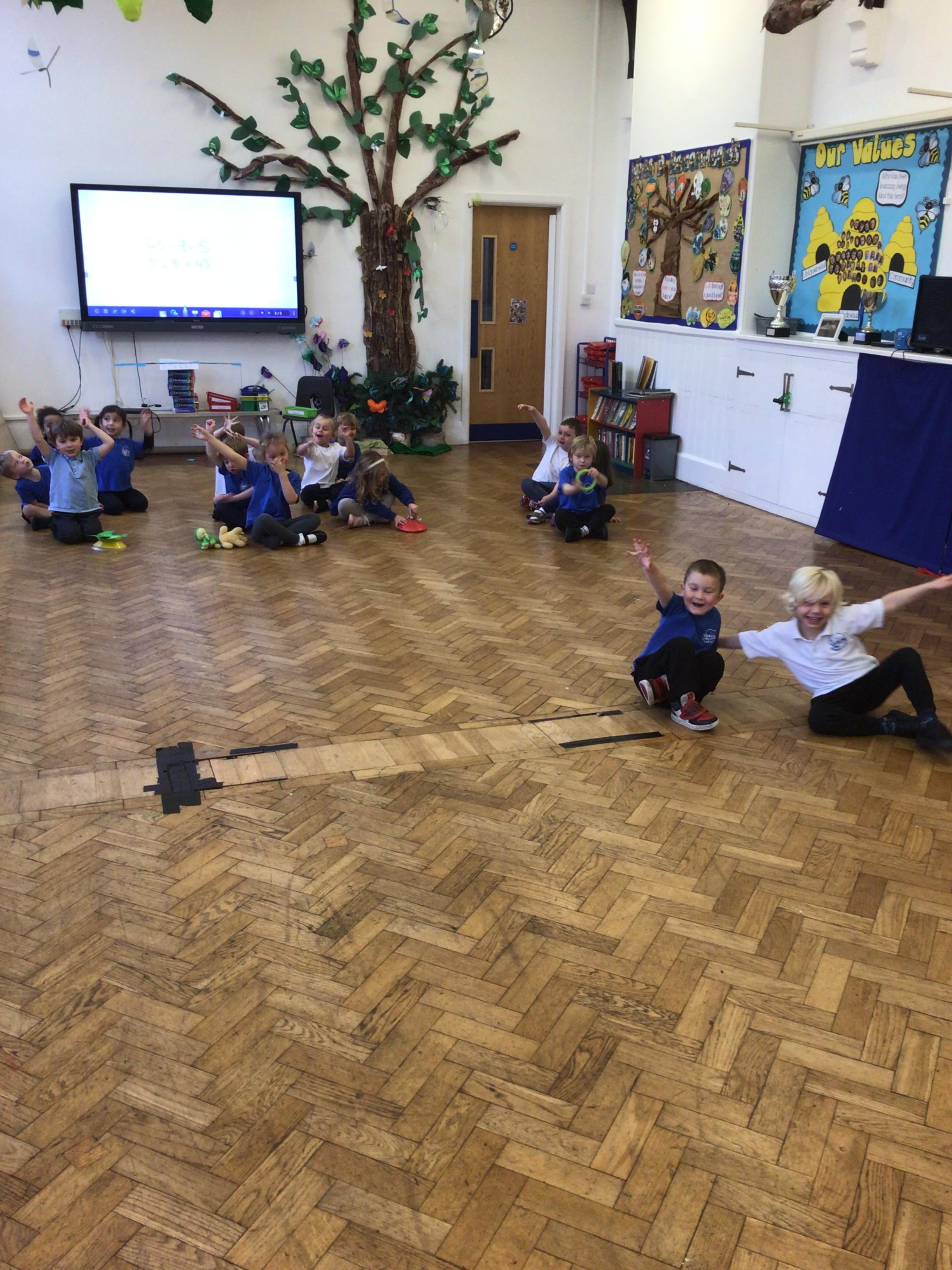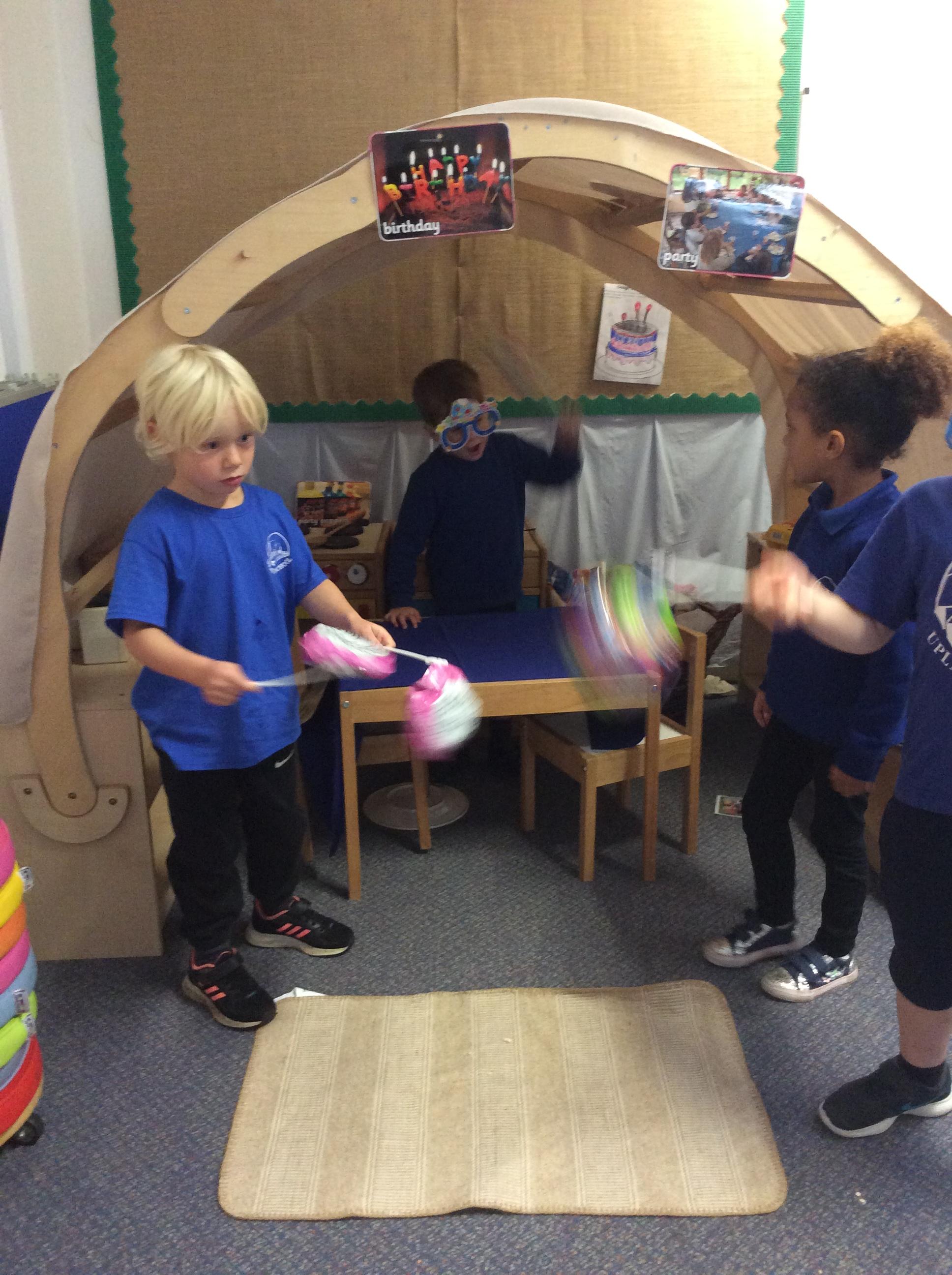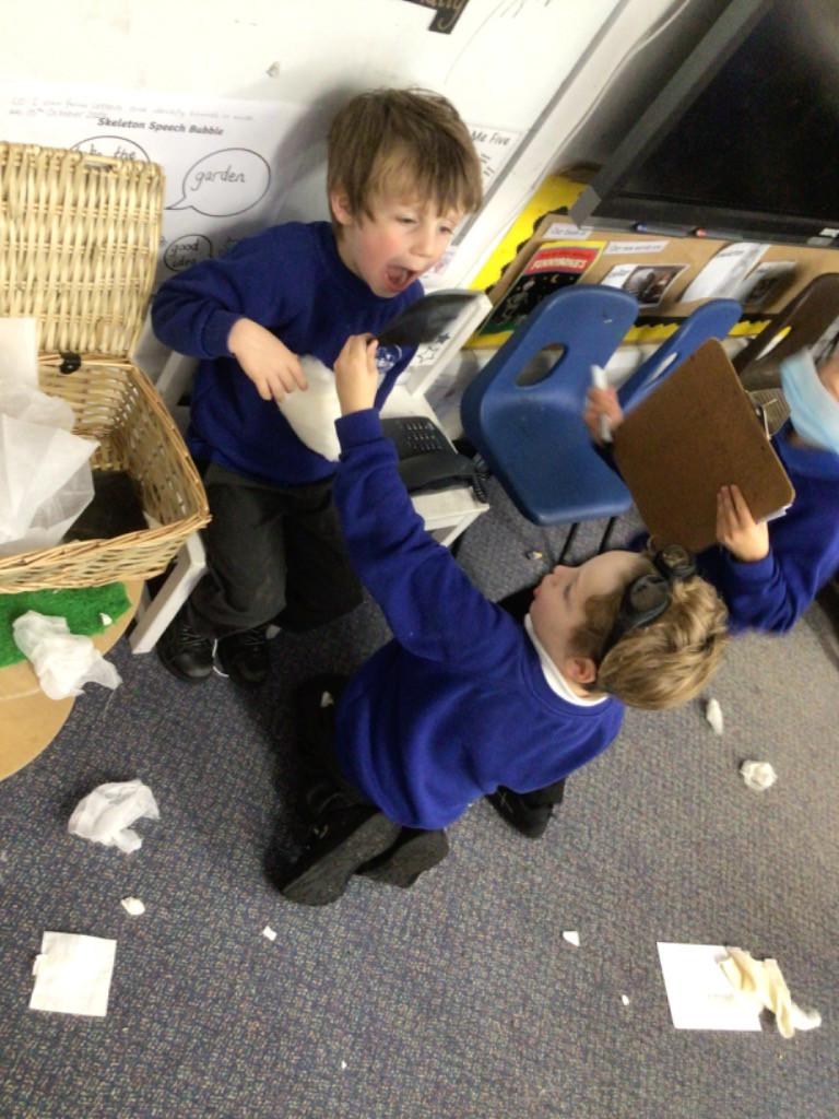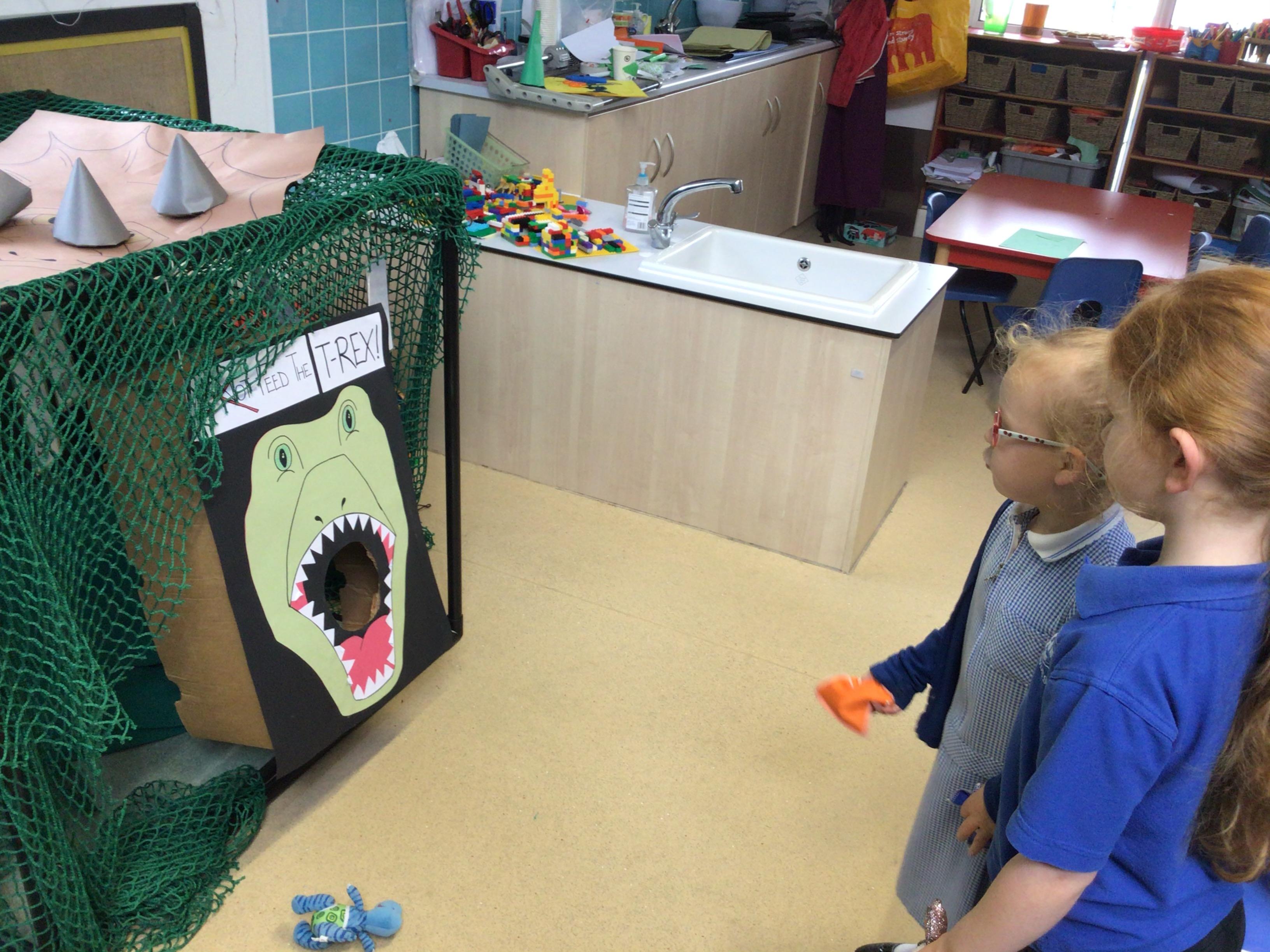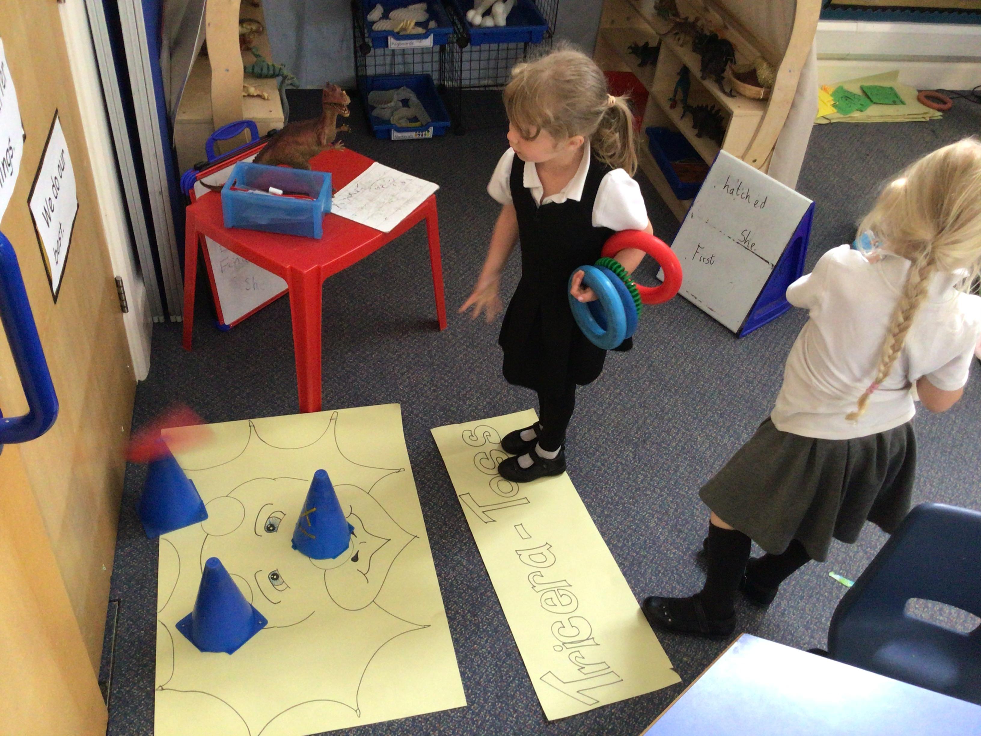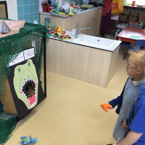 This week we have been reading the book 'Saturday Night at the Dinosaur Stomp'. It has inspired us to have our own 'stomp'. In preparation, we have written invitations to our own dinosaurs, made biscuits and party hats.Today we have held the 'stomp'. We have drunk swamp juice, eaten biscuits and played musical dinosaurs. We had some brilliant games to play ( thank you Mrs Day-Lewis), including a 'Tricera-Toss'.
