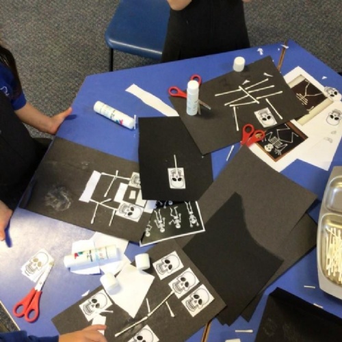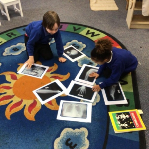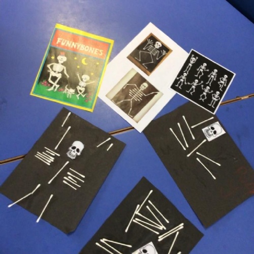 We used cotton buds to create our own skeleton artwork, we looked at X-ray images and discussed what we look like beneath our skin, muscles and fat, etc.