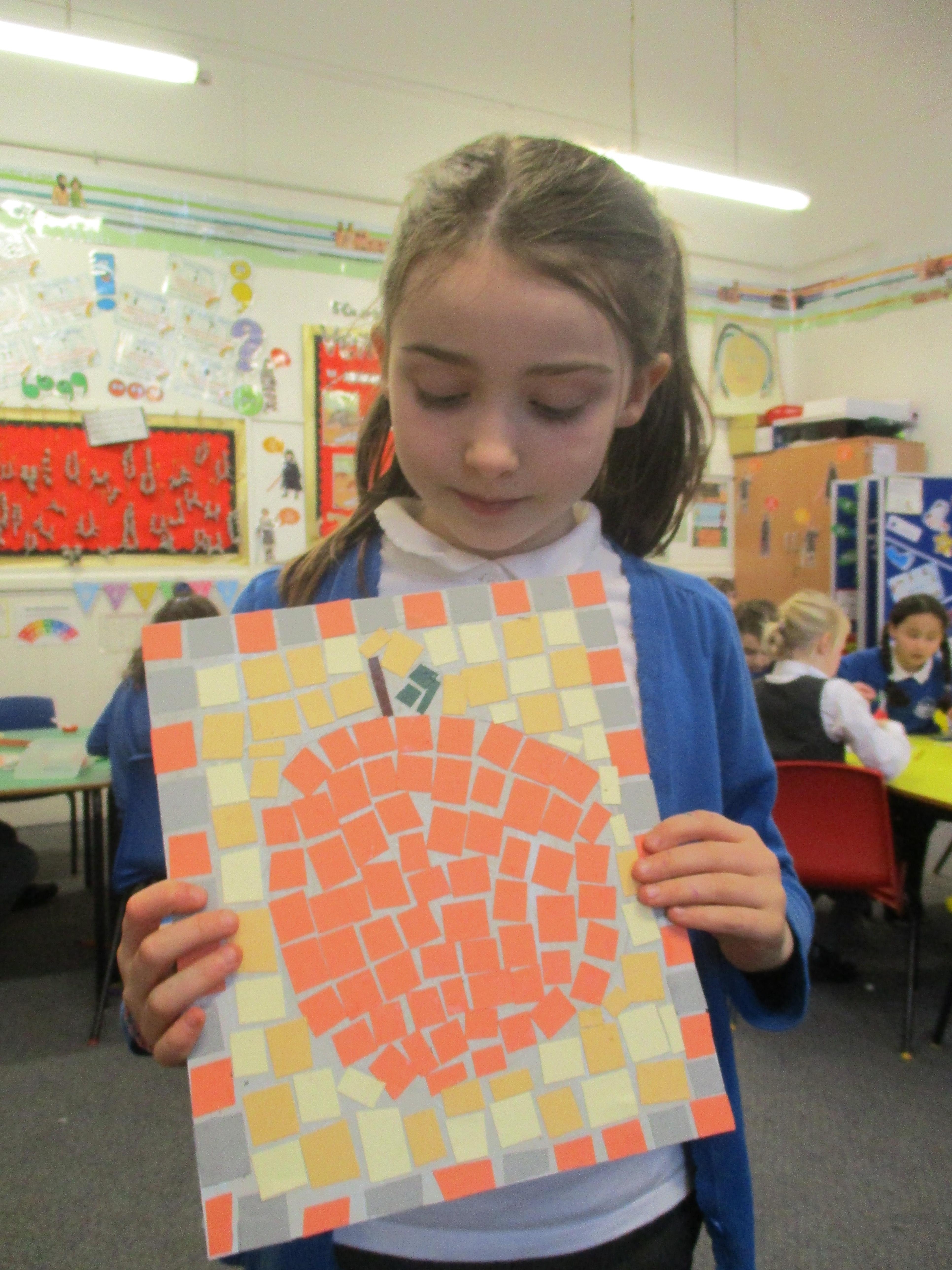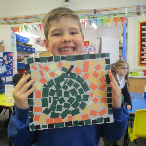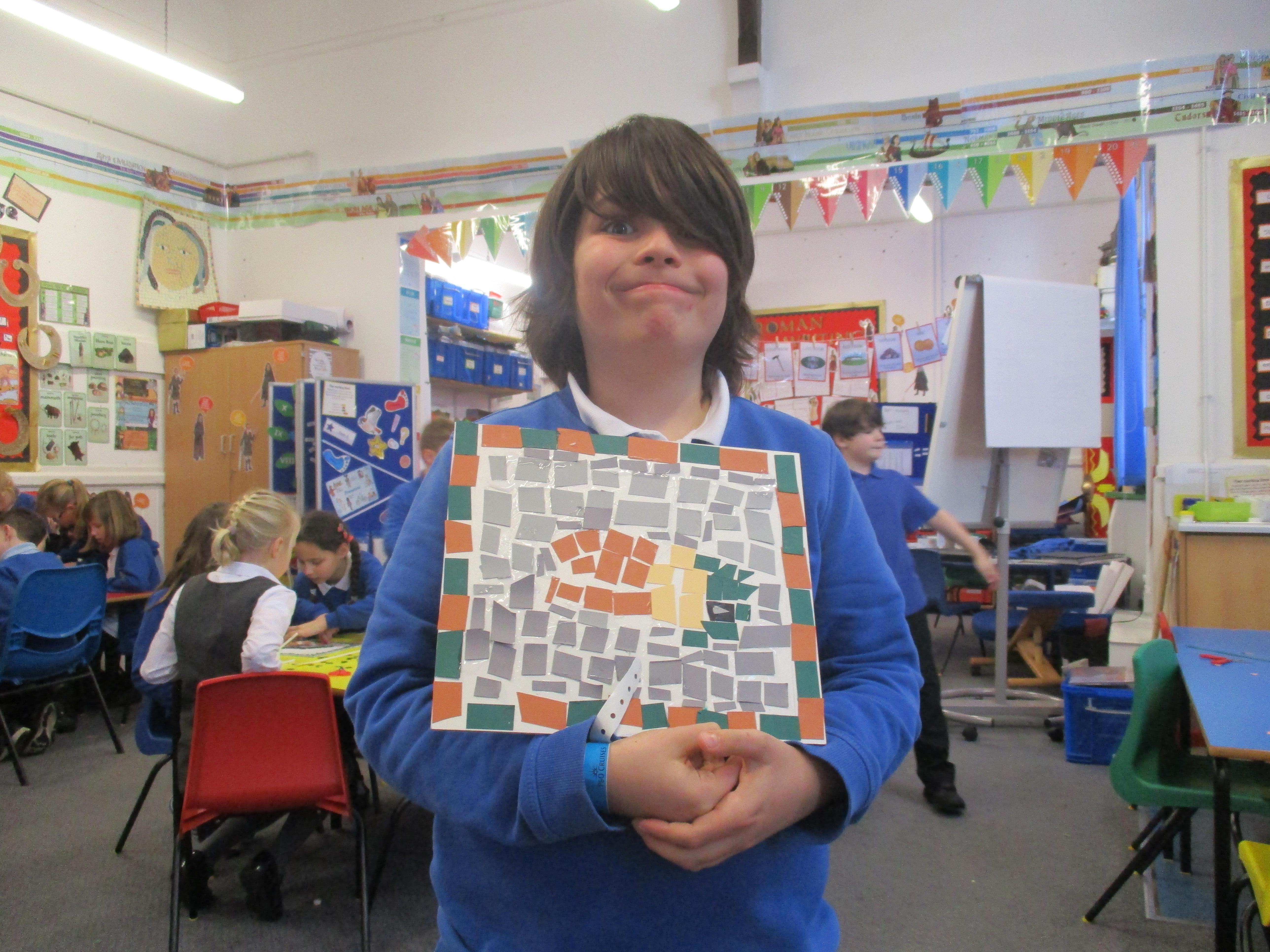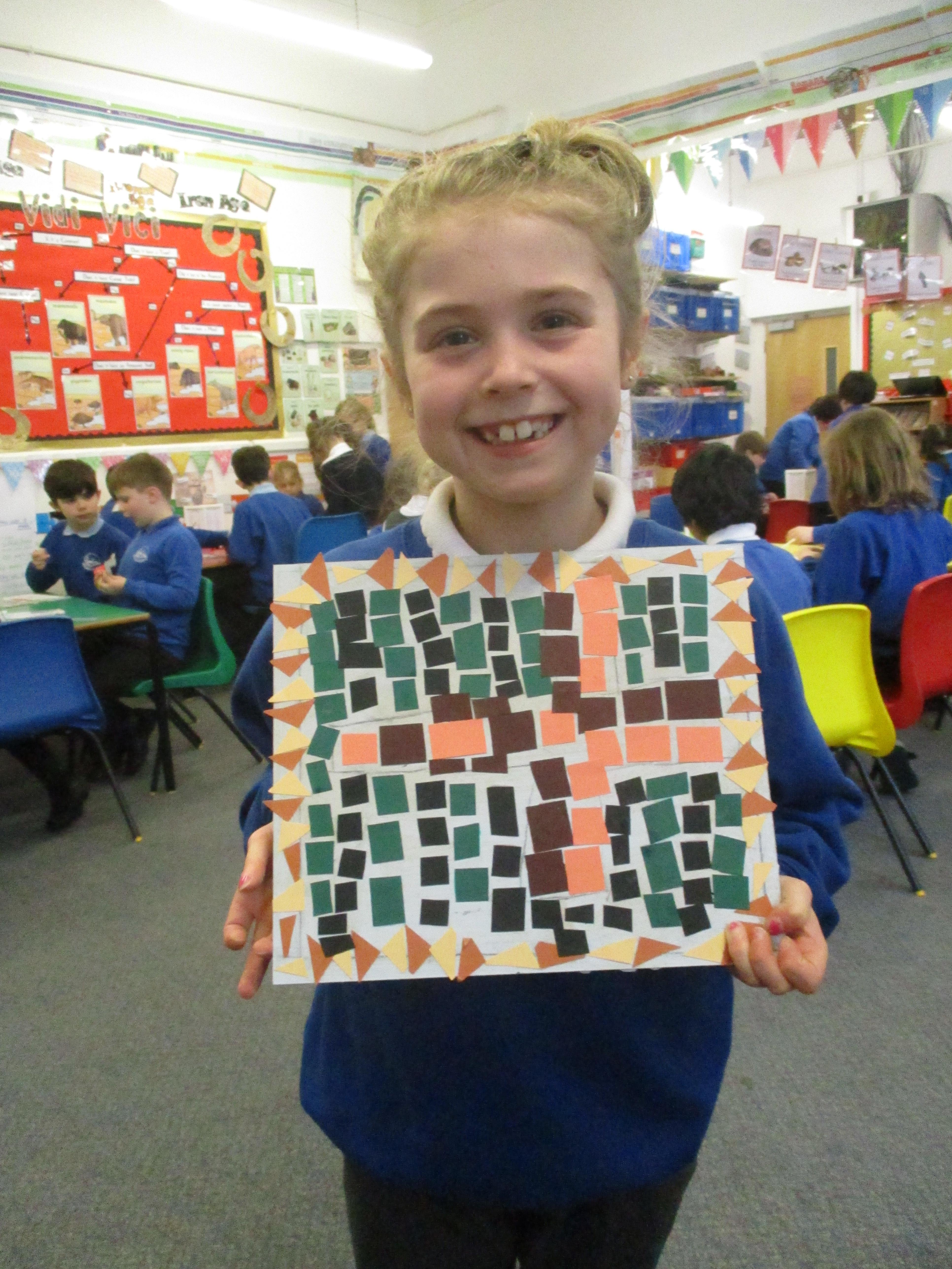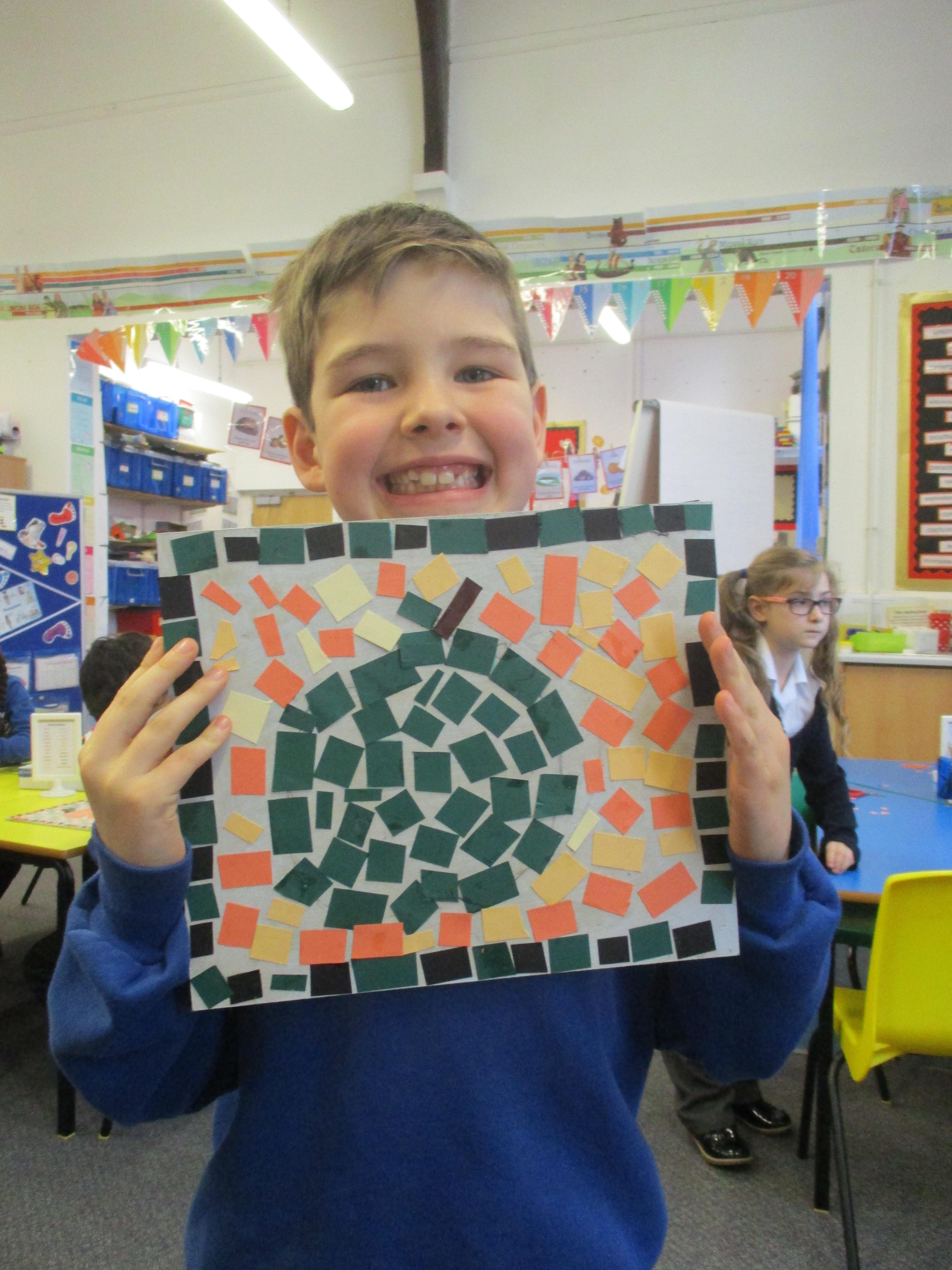 In Art we have been working on creating marvelous mosaics. Today we challenged ourselves to make a whole floor mosaic! Working in teams we persevered and are really proud to share with you