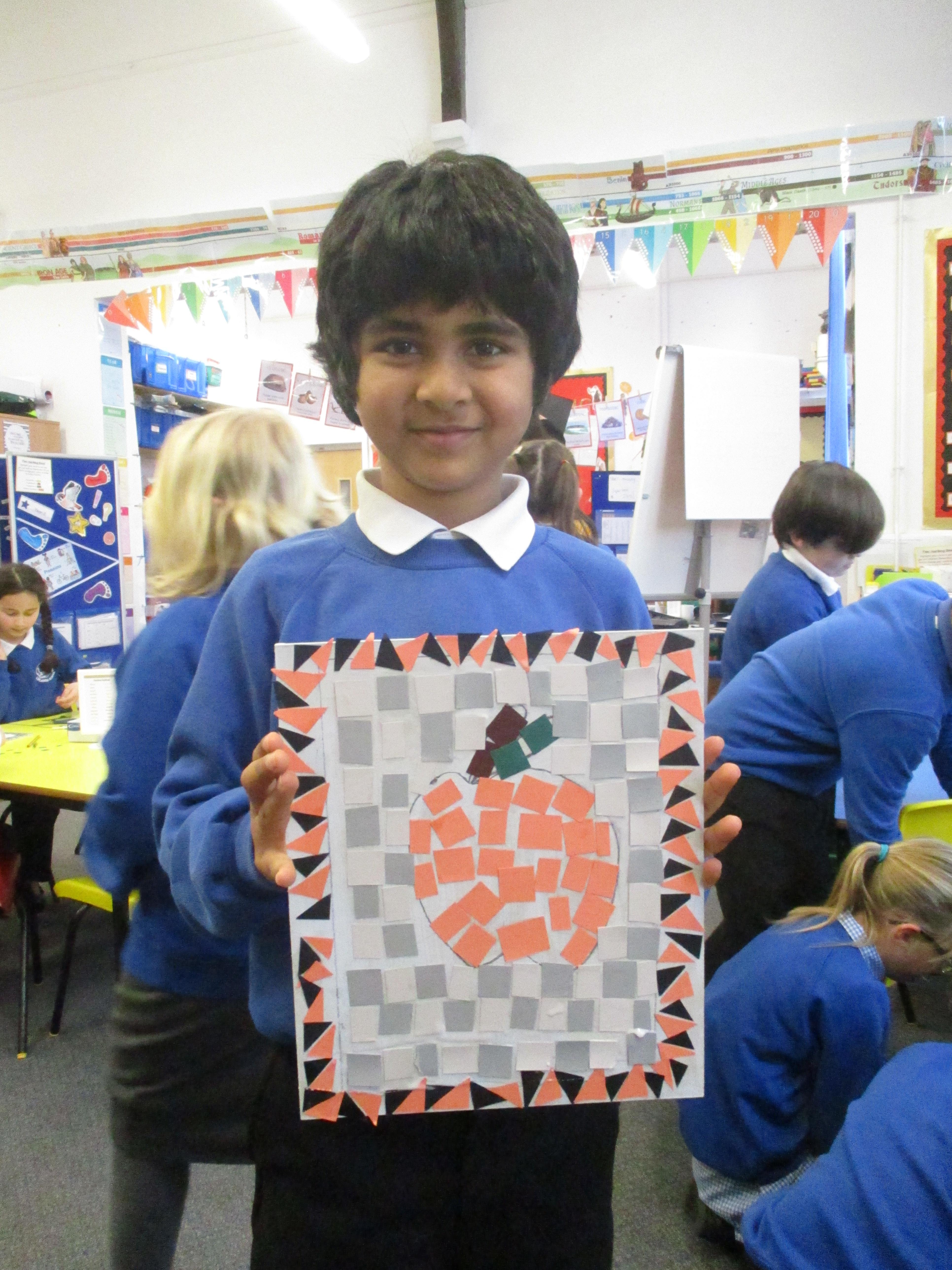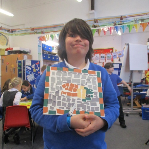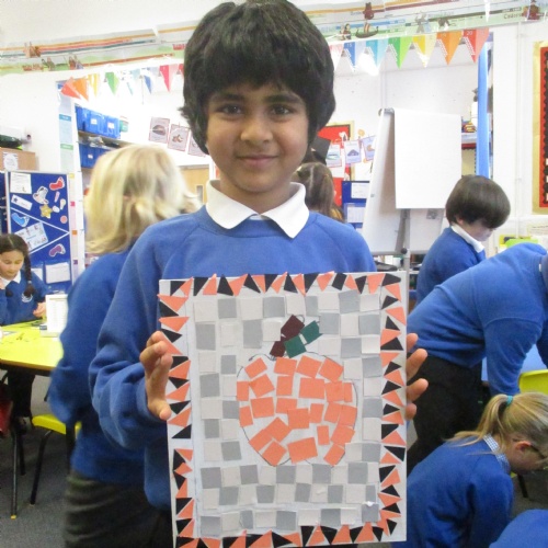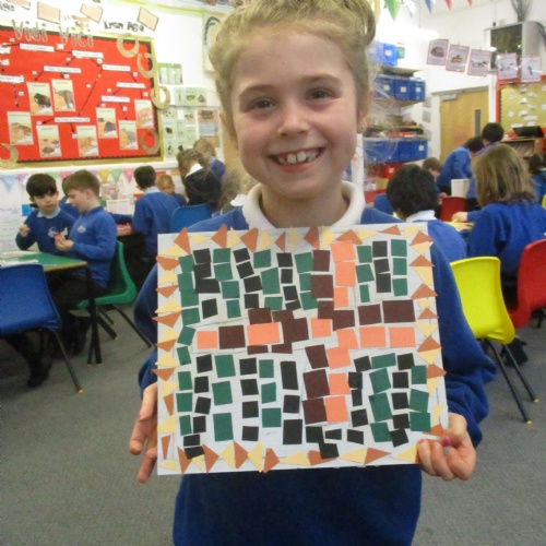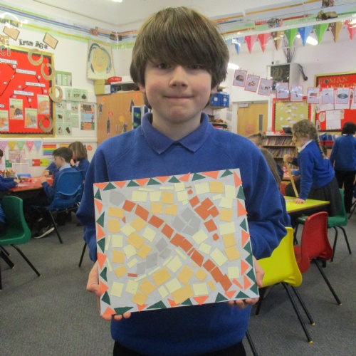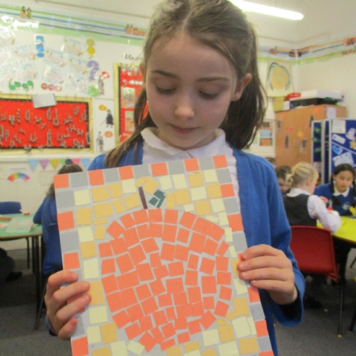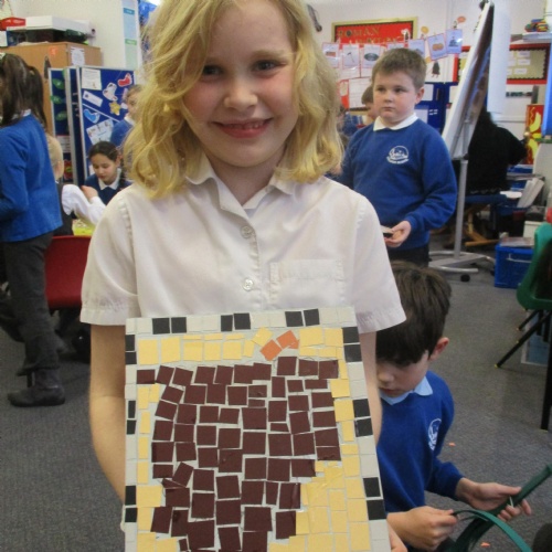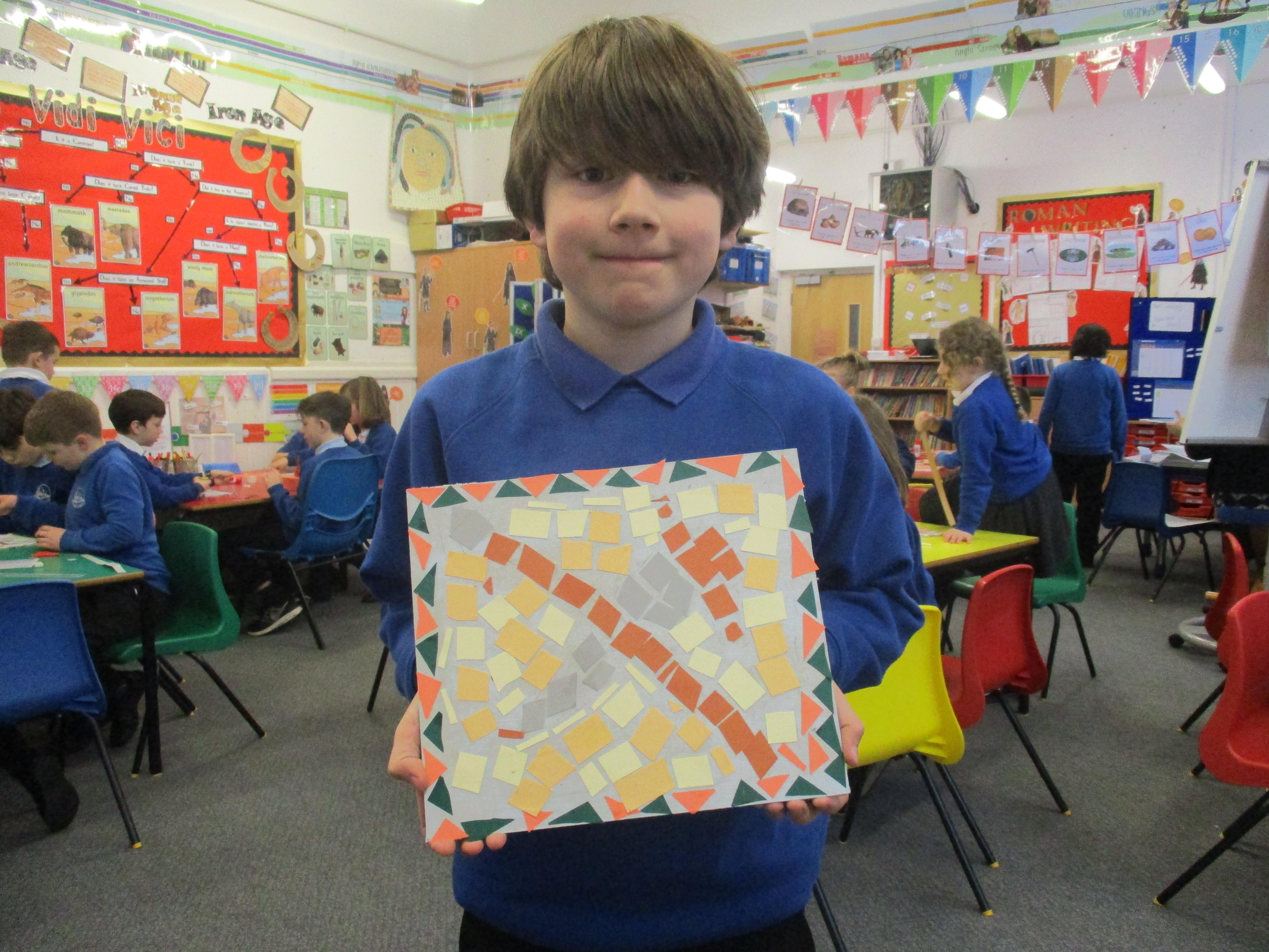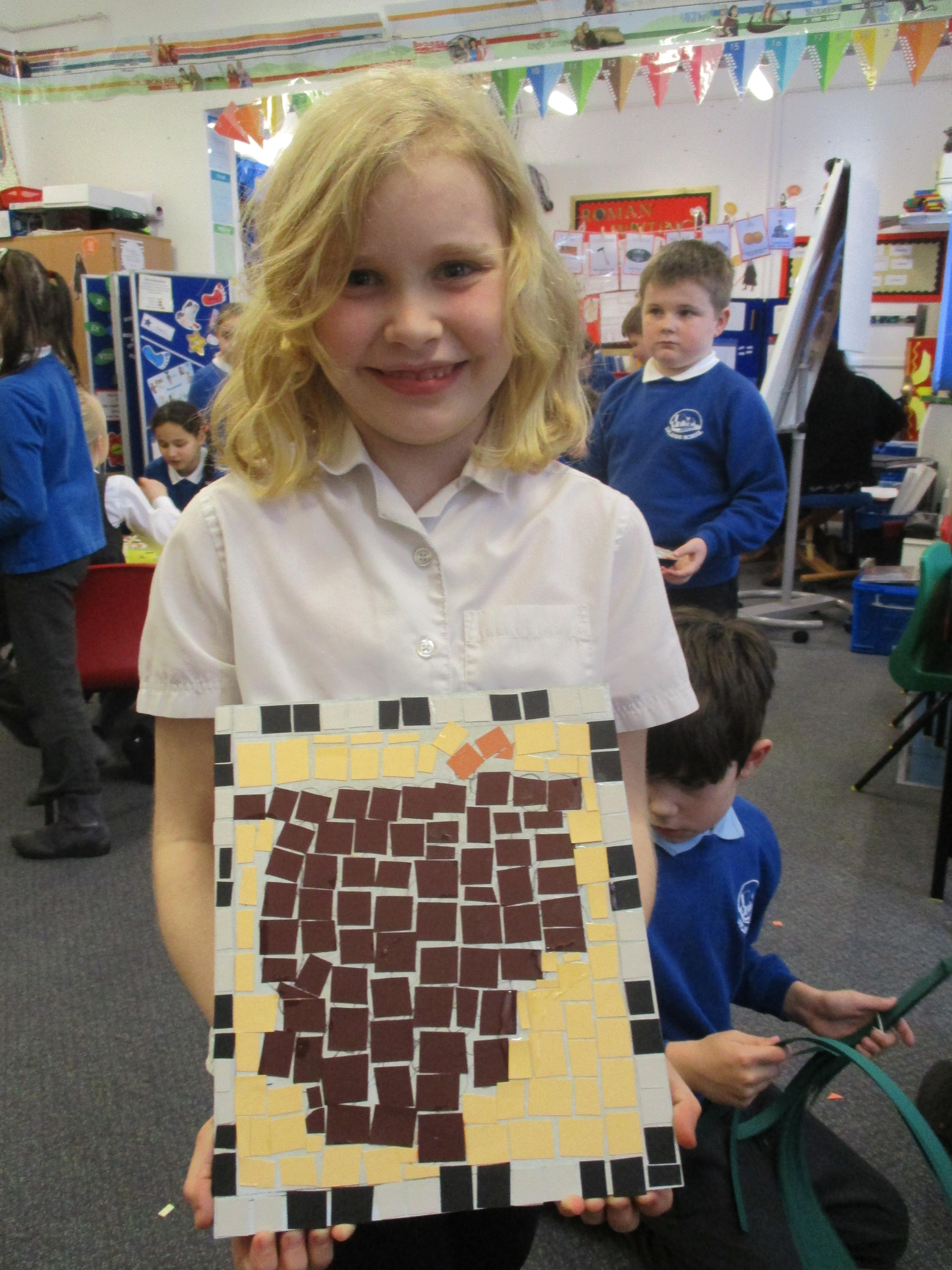 In Art we have been working on creating marvelous mosaics. Today we challenged ourselves to make a whole floor mosaic! Working in teams we persevered and are really proud to share with you