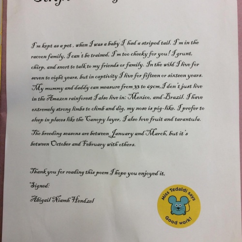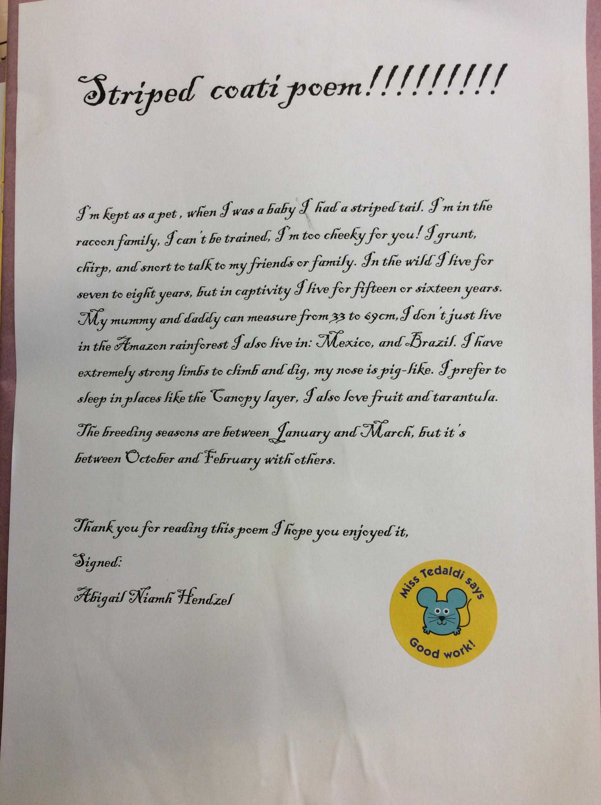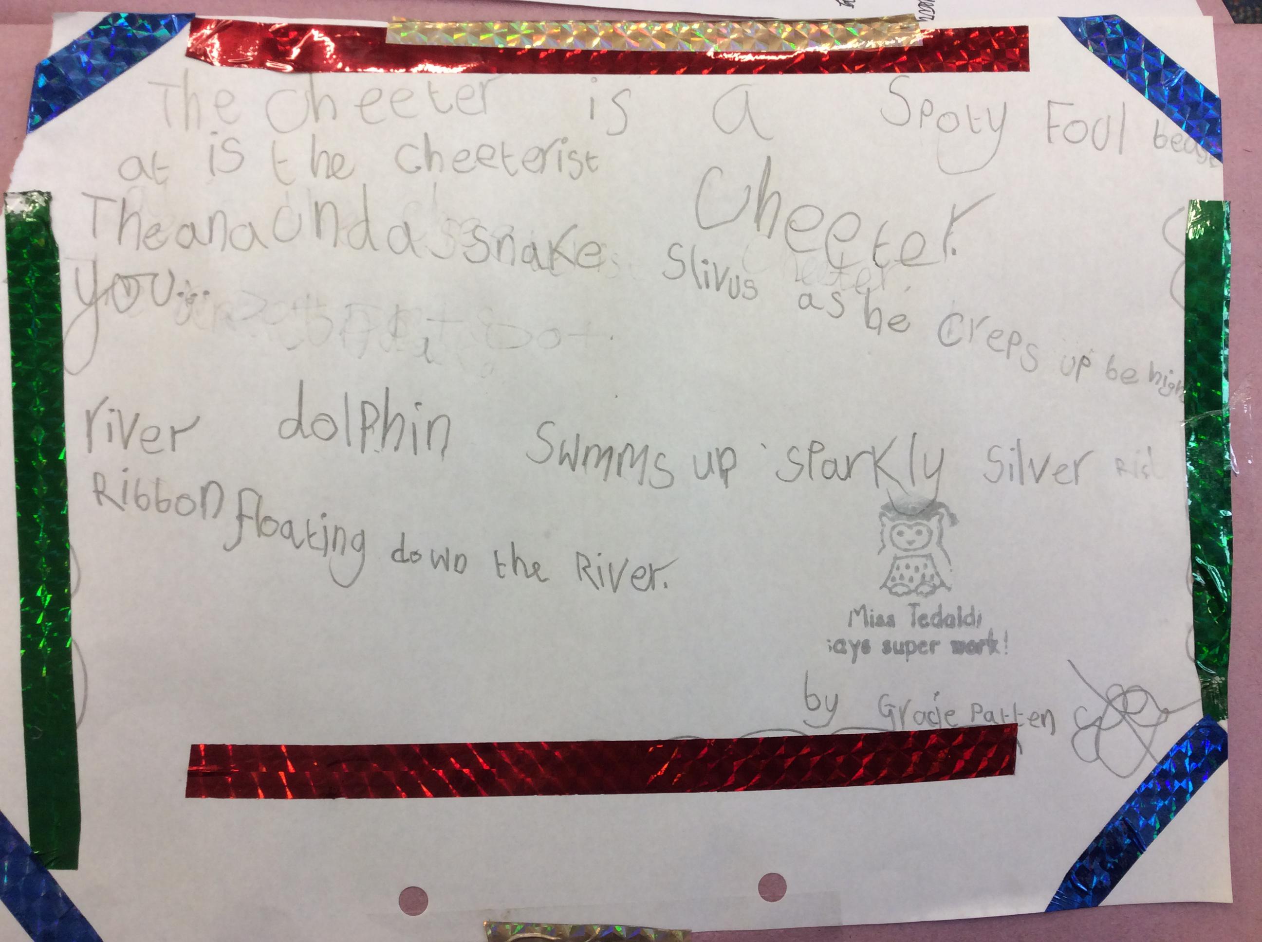 Homework this week was to write a poem about a Rainforest animal. We had some really lovely poems. Check them out below!