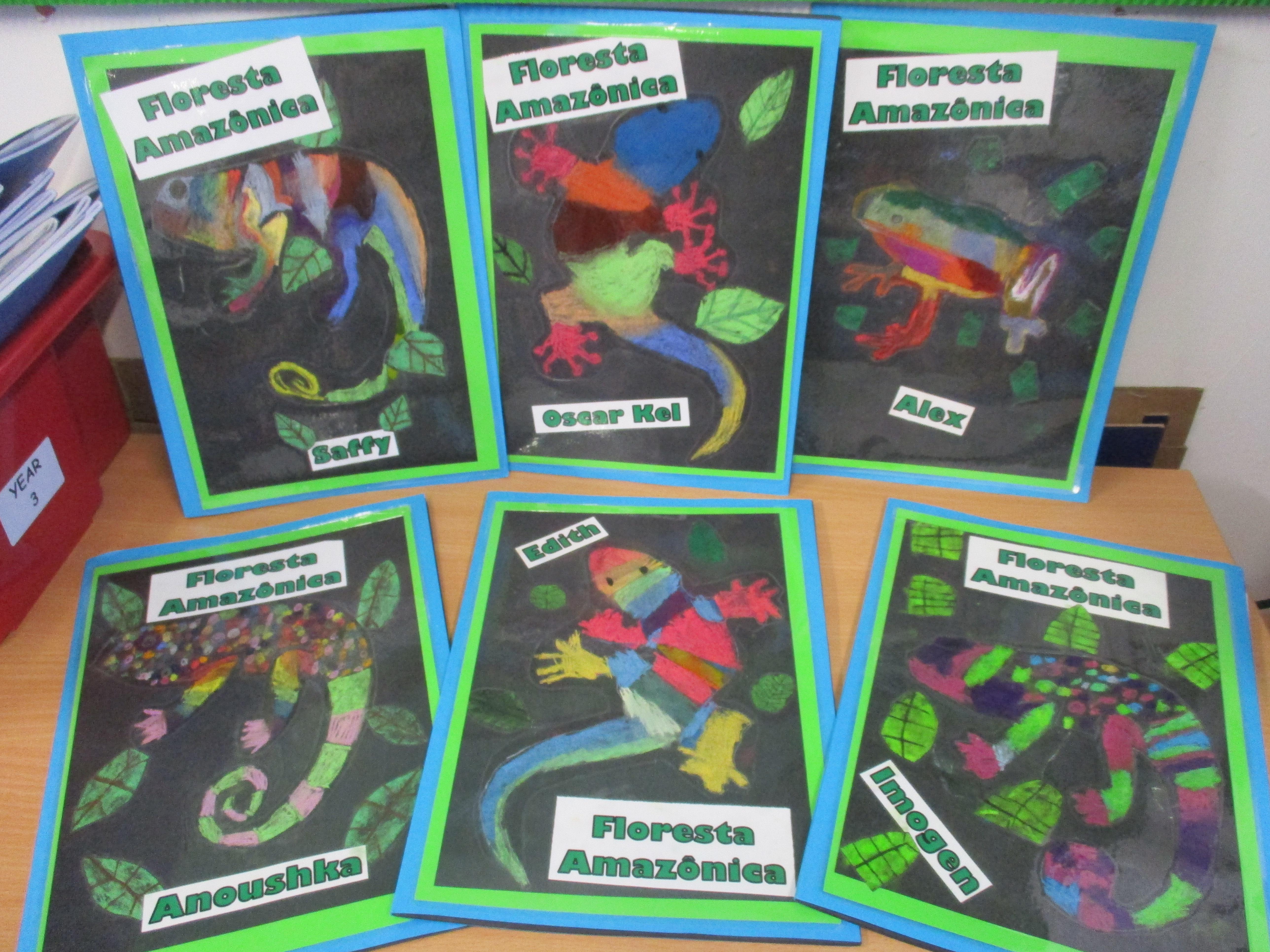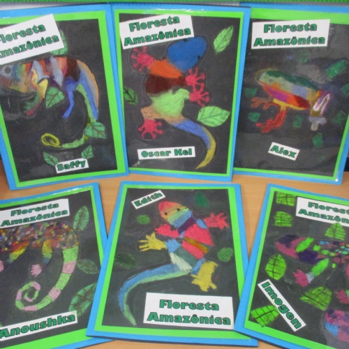 On Wednesday morning we drew the animals that we used in our cinquain and we coloured them in using oil pastels. In the afternoon with Mr Moorcroft we found out our topic for the next term which is Enter the Amazon and we looked at more animals and then we created our topic front covers by tracing around one of the animals and then using the oil pastels again to colour in the animal in bright, vibrant colours.
