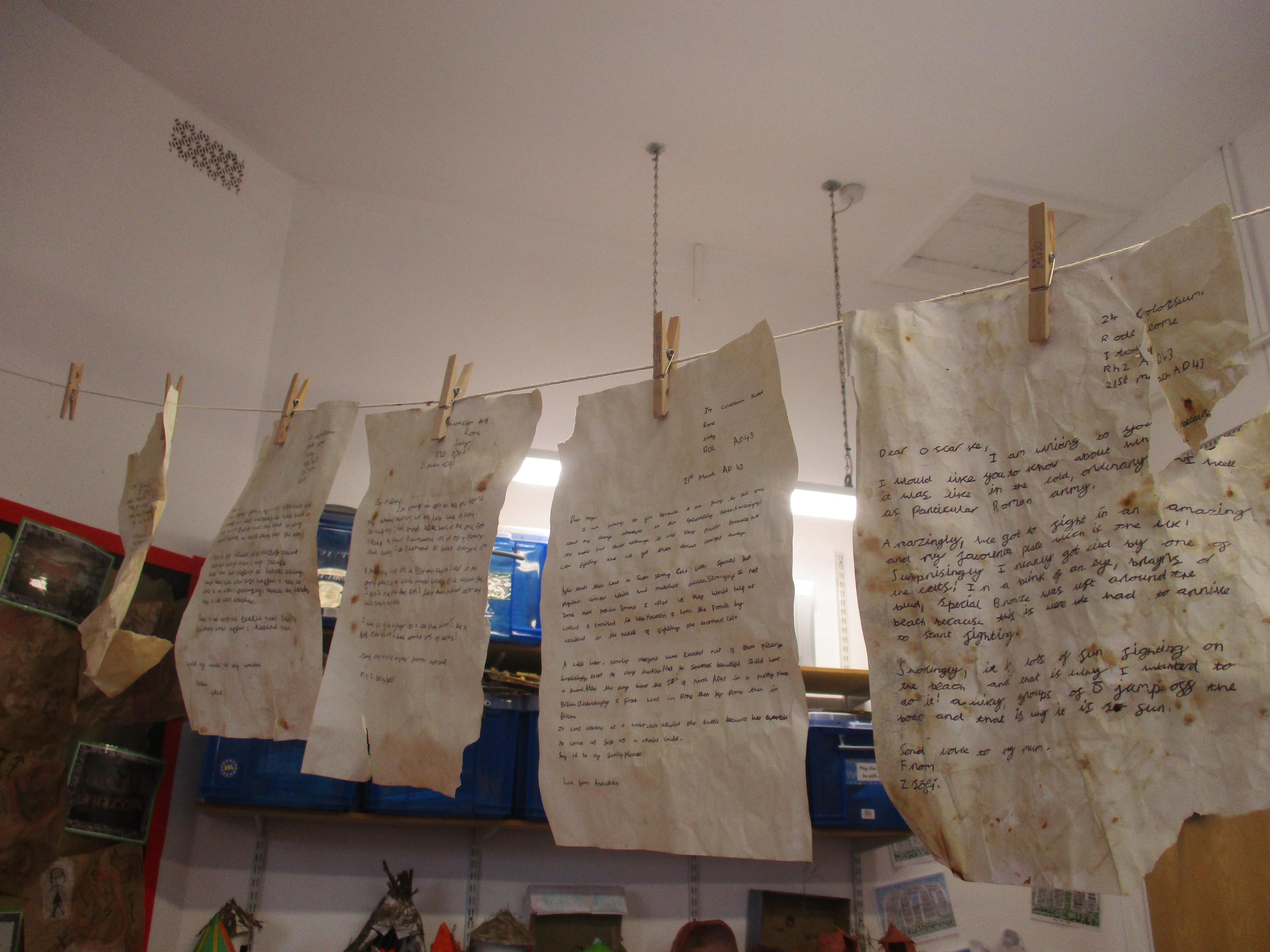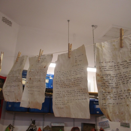 - After that we rubbed it in coffee and ripped some parts off so it looked very old and brown.